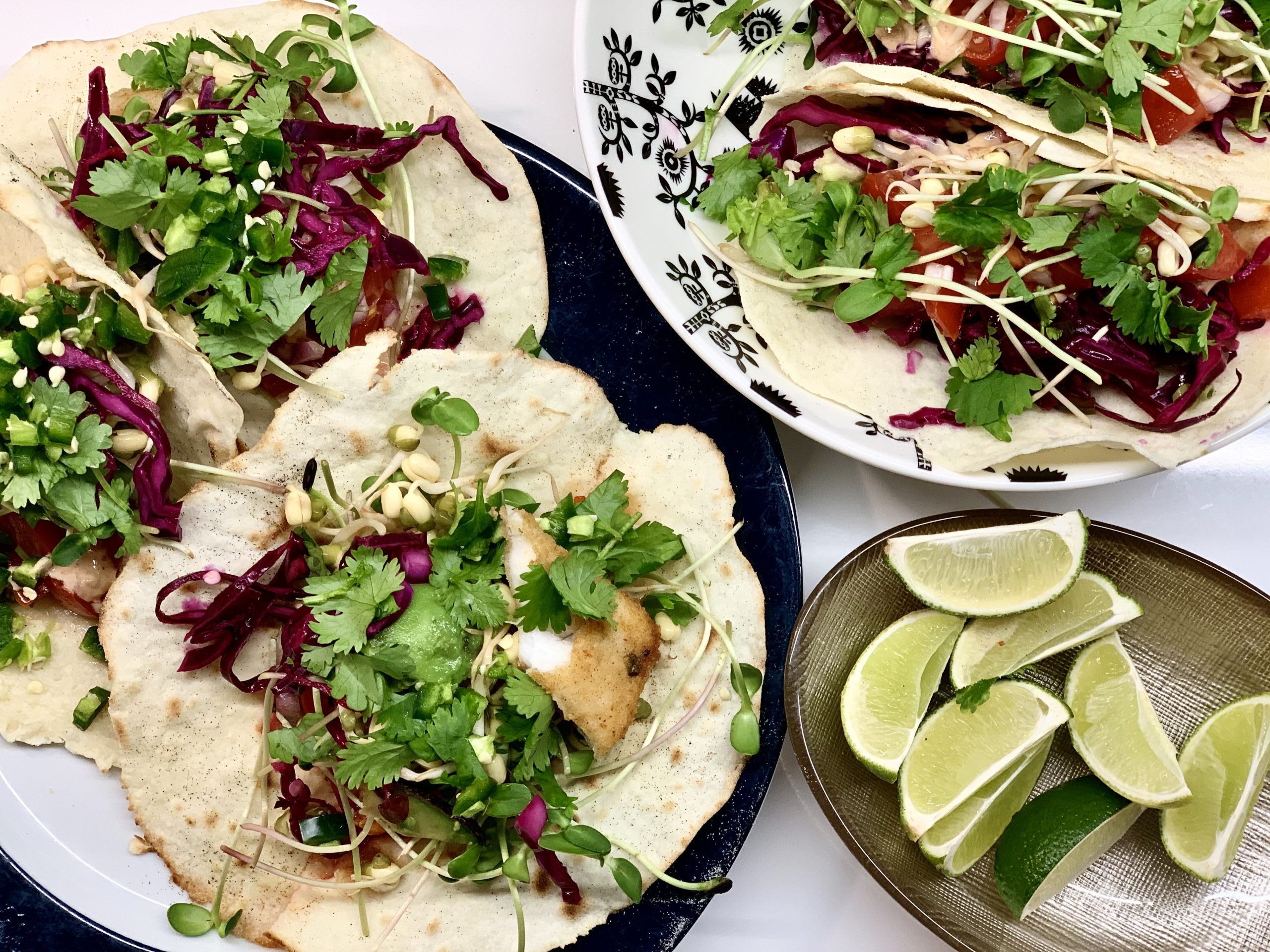 Rakastan erilaisten tortillaruokien muunneltavuutta. Eri täytteillä jokainen ruokailija saa tuunattua lettusten väliin juuri makunsa mukaisen sisällön, ja ruoanlaittaja puolestaan voi valita, tehdäkö kaiken alusta saakka itse vai luottaako valmiina saatavilla oleviin aineksiin. Viimeksi tein kalatacoja, joista voi niin ikään voi tehdä juuri niin helppoja tai vaikeita kuin haluaa. Pikaruokaversion saa kaupan tortillaletuista ja kalapuikoista, hardcore-version kotitekoisista tortilloista ja kuumassa öljyssä uppopaistetusta kalasta. Minä tein välimallia, ja oikein toimiva oli sekin. Lätyt valmistin pitkästä aikaa itse, samoin kuin punakaalisalaatin. Kalan kanssa valitsin kuitenkin helpon ja kevyen reitin, ja ainoastaan leivitin sen kevyesti vehnäjauhossa ennen paistamista. Ja arvatkaa mitä? Kalatacot eivät jääneet kaipaamaan mitään, vaan niissä oli juuri sopivasti raikasta, tuoretta kuhaa, rapeankirpeää kaalisalaattia, täyteläistä avokadoa, rouskuvia kasviksia sekä pikaversiona valmismajoneesista ja chipotletahnasta tehtyä kastiketta. ...
