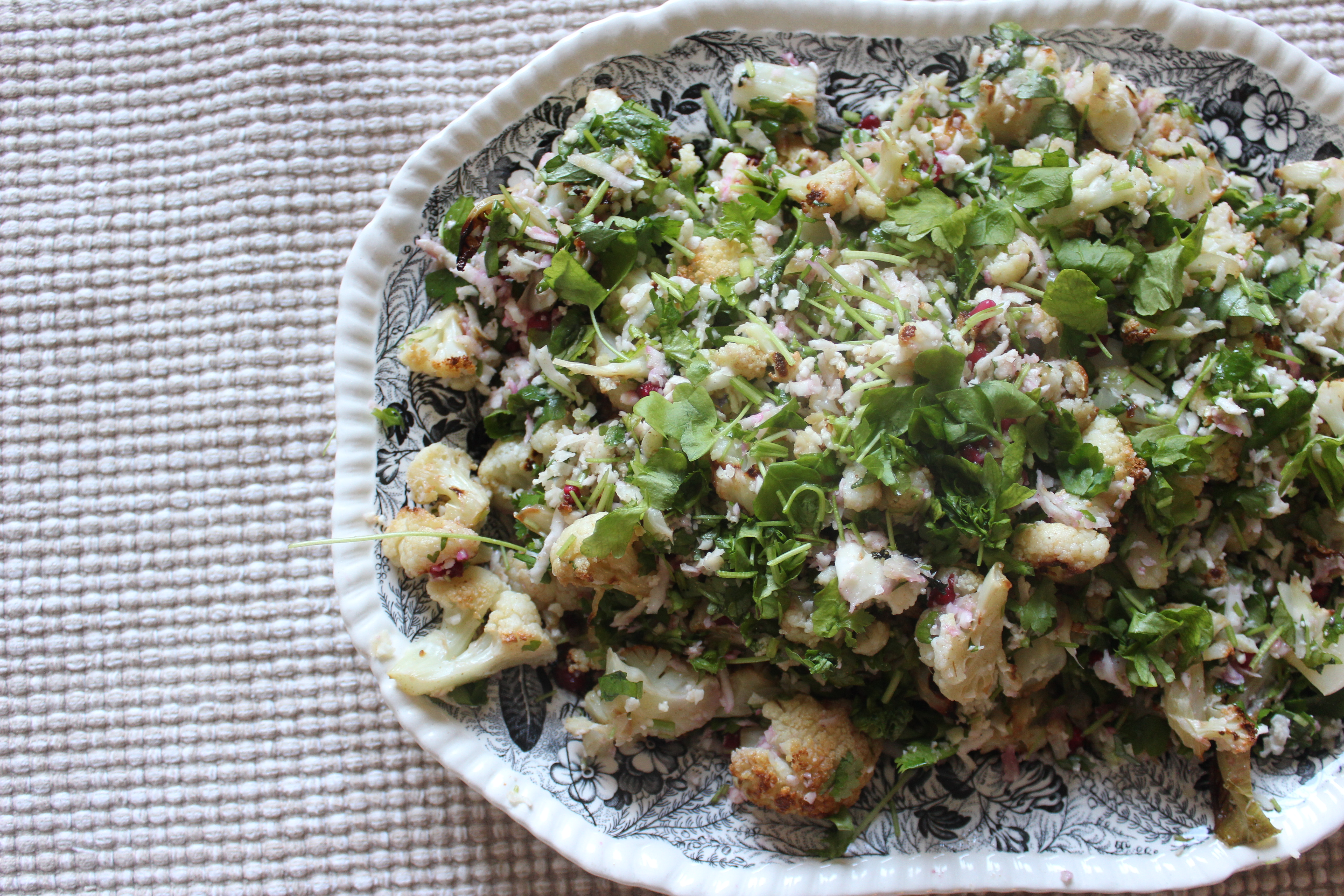 Matkalukemiseksi tarttuneessa BBC Good Food -lehdessä (lokakuu 2018) oli kukkakaalisalaatin ohje, jossa oli vinkeä juju: ohje sisältää sekä raakaa että paahdettua kukkakaalia, sulassa sovussa samassa salaatissa. En olisi itse tullut ajatelleeksi moista, mutta reseptiikan takana ollut Yotam Ottolenghi onneksi on. Raaka kukkakaali pitää salaatin ihanan rapeana kun taas paahdettu tuo siihen täyteläistä makua. Olen paahdetun kukkakaalin kohdalla taistellut monesti sen kanssa, että tekstuuri lässähtää makuuni liian pehmeäksi ennen kuin kukkikset ehtivät saada väriä. Pehmeni se tässäkin, mutta raaka kumppaninsa onnistui huijaamaan rakenteesta mukavan rouskuvan. Sitruunainen kastike ja yrtit kohottavat salaatin makumaailman kesäiseksi ja pistaasit tuovat vielä oman säväyksensä. Melkein unohdin ne, mutta onneksi ne pääsivät lopulta mukaan, sillä salaatti ei olisi sama ilman niitä. Käytin itse hieman ohjetta enemmän sitruunaa enkä rakuunaa ollenkaan, mutta alla olen jättänyt ohjeeseen alkuperäiset mitat. ...