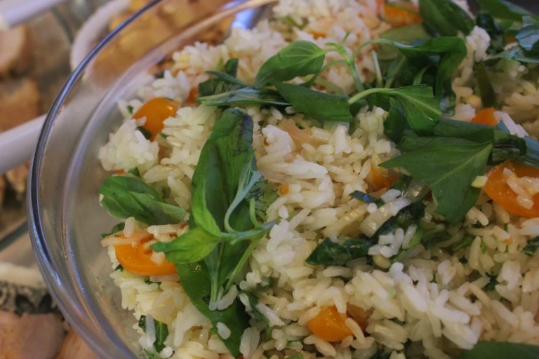 Jälkikäteen julkaisen vielä pari näitä lupaamiani nimiäistarjoilureseptejä; tämä riisisalaatti/kylmä lisuke ei tosin ole mitenkään erityisesti juhlakonteksteihin sidonnainen, vaan se toimii normaalina arkenakin. Lisukkeen juju on runsas yrttien käyttö, joilla tylsähköön riisiin saa reippaasti eloa. Pääraaka-aine eli riisi käyttäytyy parhaiten, kun sen keittää etukäteen ja jäähdyttää esim. yön yli jääkaapissa, tai jos käyttää edellispäivän riisintähteitä.