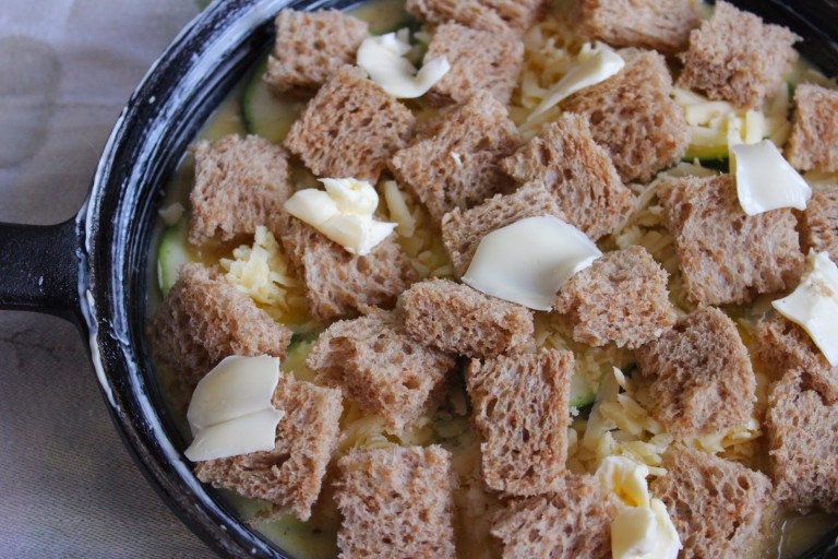 1. Voitele uuninkestävä pannu tai vuoka. Hienonna sipuli, paprika ja kesäkurpitsa ja laita ne vuokaan. Leikkaa paahtoleipäviipaleista reunat pois ja kuutioi viipaleet.