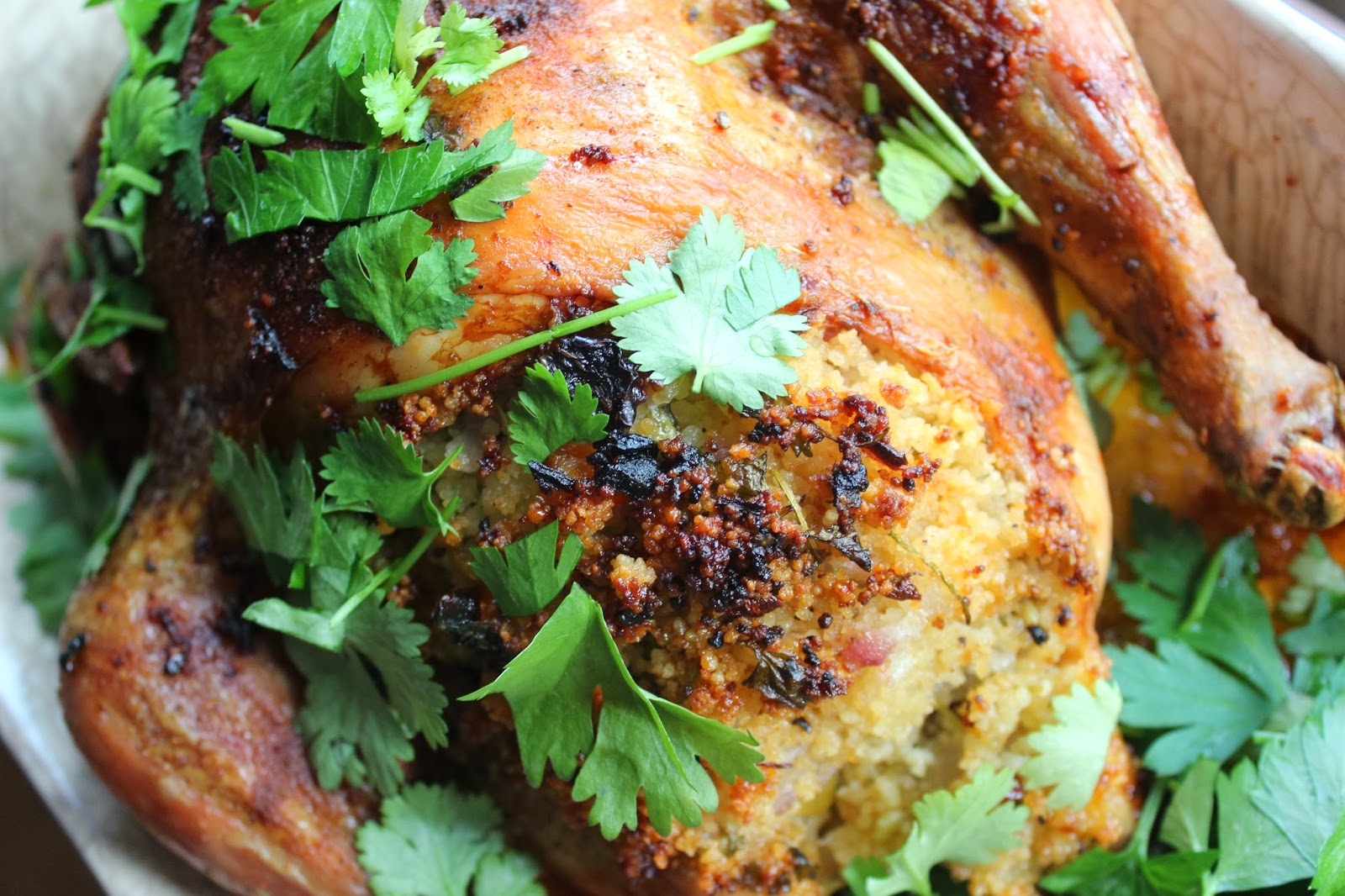 2. Huuhtaise broileri sisä- ja ulkopuolelta ja kuivaa talouspaperilla. Sekoita keskenään kuivat mausteet (mustapippuri, kaneli, juustokumina, paprika, suola) ja hiero ne broilerin nahkaan. Lusikoi couscoustäyte tiiviisti broilerin sisälle. Jos haluat, voit sen jälkeen sitoa broilerin jalat nätisti vatsan eteen, niin lopputulos näyttää siistimmältä. Lorauta broilerin niskaan vielä hieman oliiviöljyä ja lisää päälle muutama voilastu. Tässä kohtaa voit laittaa linnun maustumaan jääkaappiin tai suoraan uuniin, jos se ei ole aivan jääkaappikylmä (ja jos paistat linnun myöhemmin, ota se huoneenlämpöön vähintään 30 minuuttia ennen paistoa). Paista 175-180 asteisessa uunissa noin puolitoista tuntia, kunnes nahka on kauniin ruskea ja lihasnesteet kirkkaat. Anna vetäytyä folion alla 20 min ennen tarjoilua.