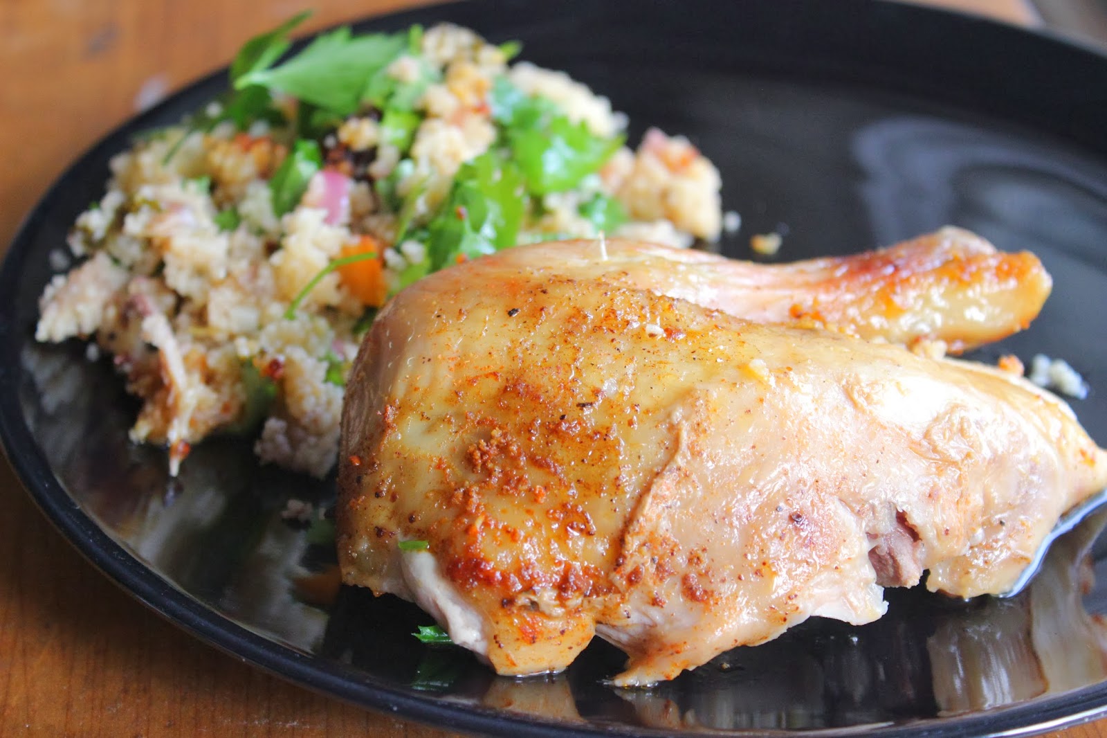 Joskus on kiva tehdä ruokaa hankalimman kautta ja pitkän kaavan mukaan, mutta suurimman osan ajasta arvostan kyllä suuresti, jos puuha on mahdollisimman vaivatonta ja tiskiäkään ei tulisi ihan tolkuttomasti. Männäviikolla taiteilin itselleni marokkolaishenkistä - huom. henkistä, koska mausteiden kanssa mentiin ihan vaan sillä, mitä kotoa ja lähisiwasta löytyi - uunibroileria, jossa koko ateria valmistui samassa paketissa, nimittäin broiskun sisällä. Lintu sai täytteekseen kasvispitoisen couscousin, joka sai mukavasti osakseen paistomehuja ja makuja uunissa muhiessaan. Koostumuskaan ei mennyt liian puuroksi. Mukavaa oli, että broilerin sai tehtyä uunivalmiiksi jo etukäteen, ja itse valmistus oli sitten todella helppoa, kunhan otti linnun ajoissa huoneenlämpöön ja laittoi uuniin. Tiskiäkään ei tullut kuin broilerin valmistusastia, leikkuulauta sekä kattila, jossa esivalmistin couscousin.
