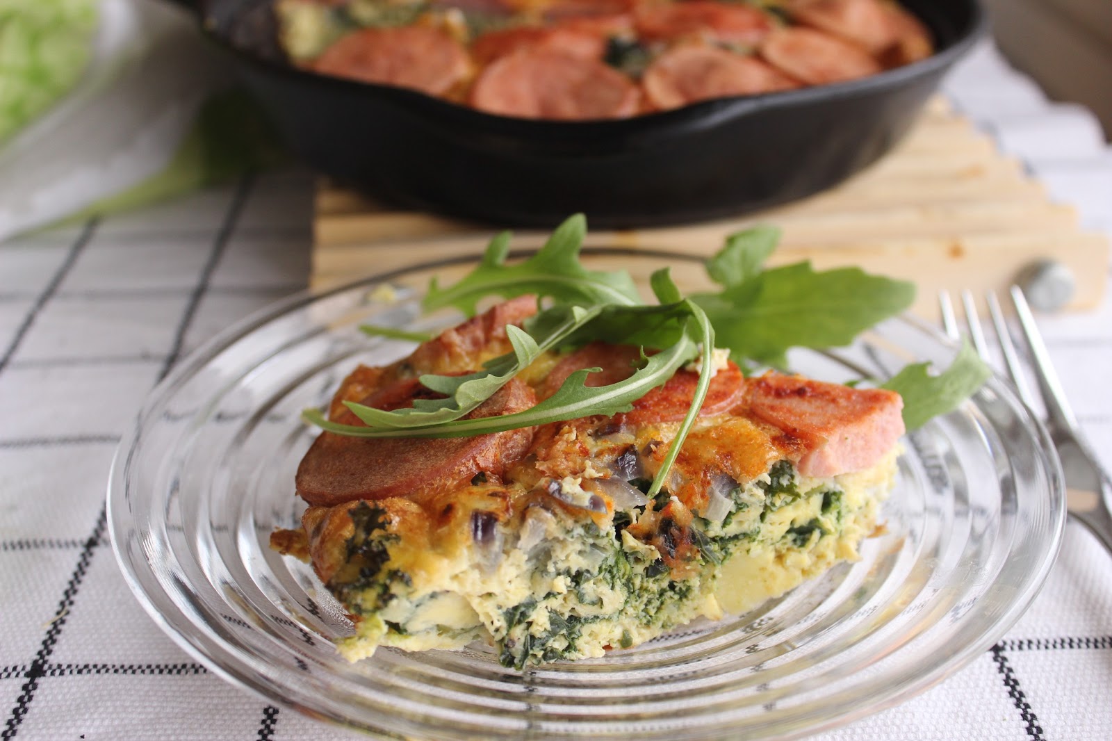 Taideteokseni kisaan oli lenkki-lehtikaalifrittata, jossa lenkki sai kaverikseen talvista lehtikaalia perinteisempien munan ja perunan kera. En tullut keksineeksi pyörää uudestaan, mutta olin tyytyväinen lopputulokseen. Rehti, toimiva makkararuoka!