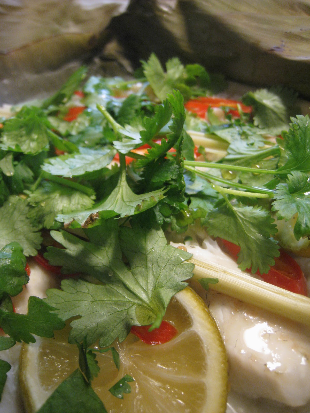 No, tekeminen helpotti. Kun sain itseni kerättyä aloituspisteeseen asti, ryhtyi touhu etenemään ainakin mekaanisesti, ja hetken kuluttua jo melkein luontevasti. Banaaninlehdessä höyrytetty kuha syntyi alun perin isännän toiveesta saada höyrytettyä, yrteillä maustettua valkoista kalaa, jollaista joskus olemme syöneet Lemon Grassissa ja sittemmin tehneet kotonakin. Kuha valikoitui hallin Reitin kalasta, mutta banaaninlehdet olivat heräteostos, joita halusin nyt testata höyryttämiseen. Lehdissä oli erikoinen, teemäinen tuoksu, joka uunissa alkoi oikeasti muistuttaa isännän mainitsemaa mustikkapiirakan tuoksua. Aromaattinen tuoksu tuntui myös vienona makuna kalafileissä, joista muuten tuli ihan kelpoja allekirjoittaneen koomasta huolimatta. Banaaninlehteä jäi pakastimeen yli tämänkertaisen tarpeen, joten sitä tulee jatkossa kokeiltua muihinkin juttuihin - Googlen aarreaitasta löytyi mm. ihanan kuuloisia ohjeita banaaninlehdessä savustamiseen ja grillaamiseen.