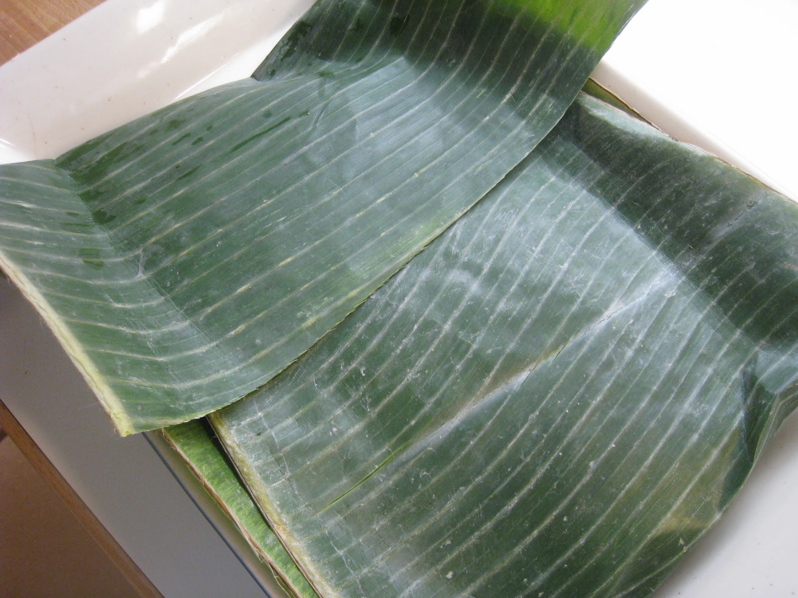 banaaninlehteä (laskin, että käytin kääröön noin 50x50 cm lehteä, joka oli kahtena 25 x 50 cm palana)