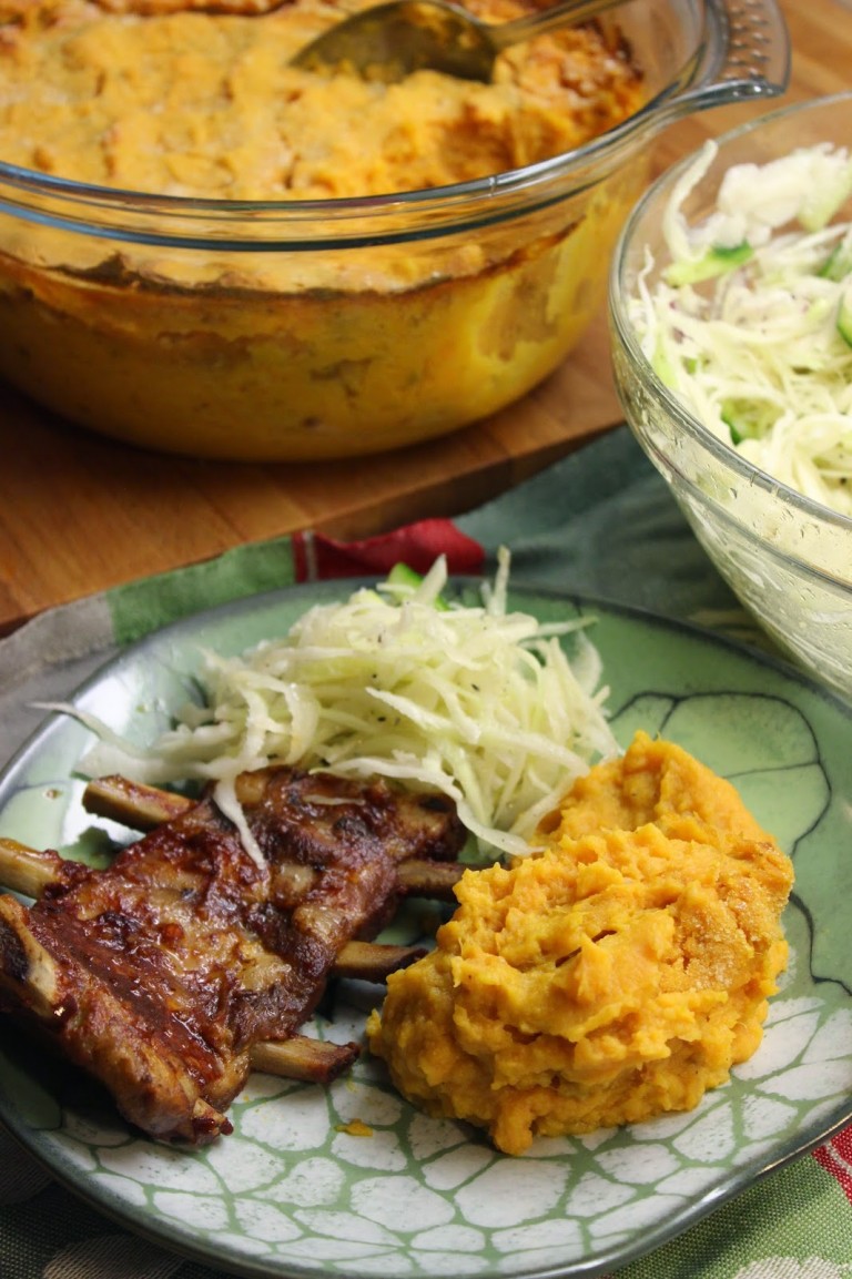 Tällä kertaa olin ostanut muutaman bataatin jääkaappiin ja ennen kun ne itse kävelisivät ulos, halusin tehdä niistä jotain lisuketta possun ribseille. Ja kun joulunaikakin alkaa olla käsillä, niin päätin kokeilla jouluisen mausteista bataattilaatikkoa. Monellehan se on noussut joulupöydän suosikiksi perinteisten laatikoiden ohi, mutta minun pöytääni se ei ole jotenkin mahtunut, kun niissä vanhoissa suosikeissakin on niin paljon syötävää :) Tämän kokeilun perusteella uskallan kuitenkin suositella bataattilaatikkoa minäkin, sekä joulupöytään että tällaisen bbq-maustetun possunlihan kaveriksi. Valitettavasti ribsini eivät onnistuneet niin hyvin tällä kertaa, maut olivat kohdillaan mutta lihasta ei tullut sellaista luusta putoavaa kuten yleensä, vaikka ihan tutulla ohjeella teinkin.