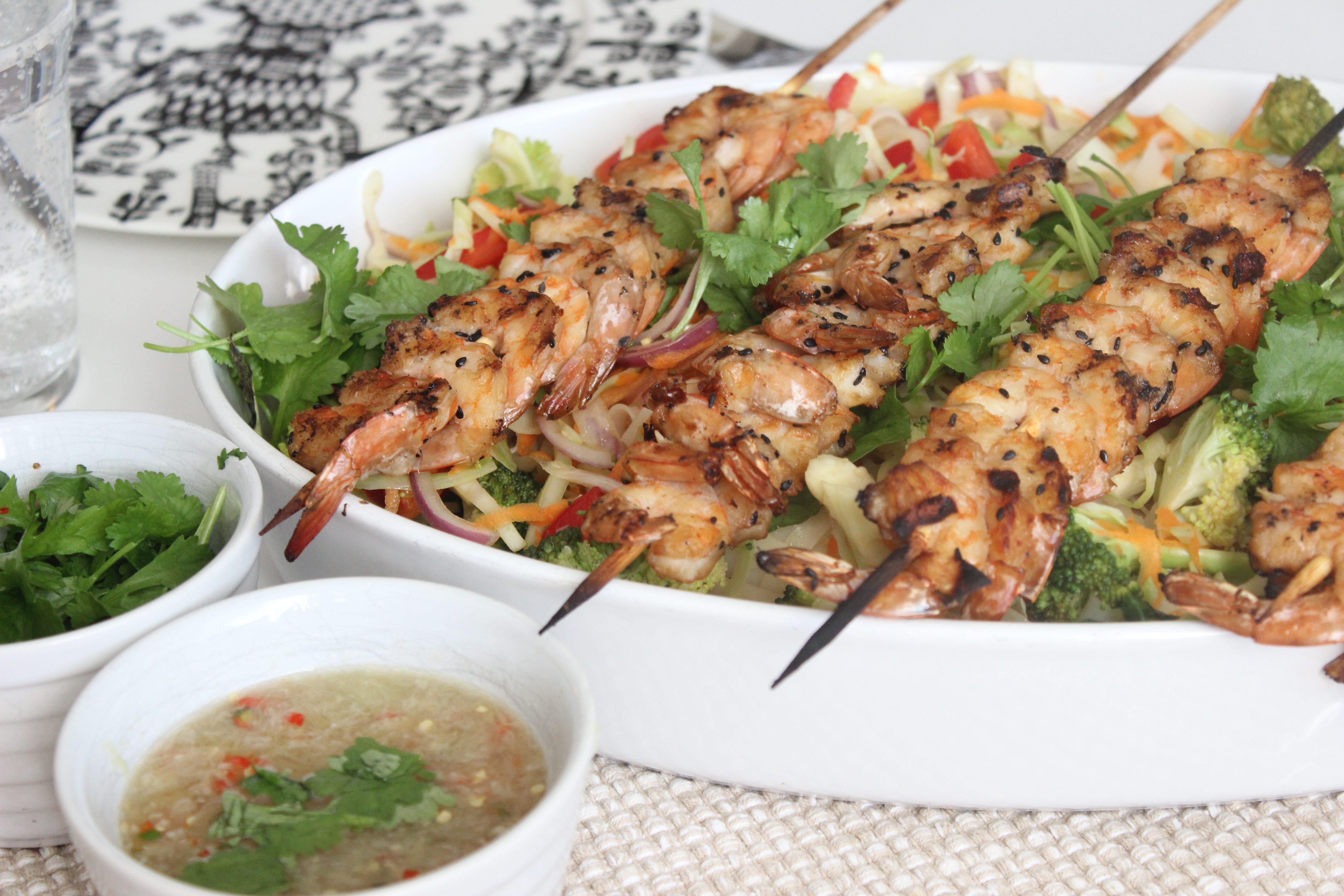 Kuka arvaisi, että lomallekin leviävien ruuhkavuosien keskellä löytyy aikaa nyhertää greippilusikalla hedelmälihaa limetistä? Sellaista löysin itseni kuitenkin tekemästä. Nyhertämistä seuraava ateria oli ihanan kesäinen, sellainen, joka tuo samaan aikaan mieleen menneet ulkomaanmatkat ja sopii kuitenkin Suomen suveen kuin nenä päähän. Aterian päätähti ei ollut kuitenkaan tuo nyhertämäni lime eikä edes nuudelisalaatti, johon sitä käyätin, vaan ihanan helpot ja maukkaat vartaat jättikatkaravun pyrstöistä. Käytin nyt valmiiksi putsattuja ja kypsennettyjä jättikatkaravun pyrstöjä, joten valmistukseksi jäi oikeastaan vain marinointi ja loppusilauksen antaminen grillissä, helppoa kuin mikä! Kypsät ravut toimivat hyvin, kunhan eivät unohdu grilliin liian pitkäksi aikaa. Rapujen kaveriksi tein raikasta nuudelisalaattia, jonne upposi riisinuudelin lisäksi reilu valikoima uuden sadon kasviksia, sekä yhtä suosikkidipeistäni, vihreää thaimaalaista chilidippiä, joka ei näytä juuri miltään mutta on grillatun kalan tai merenelävien kanssa aivan täydellistä. Vihreän chilin puutteessa dipistä tuli kyllä nyt ihan muun väristä, mutta se ei makua huonontanut. Suosittelen, suosittelen, suosittelen! ...