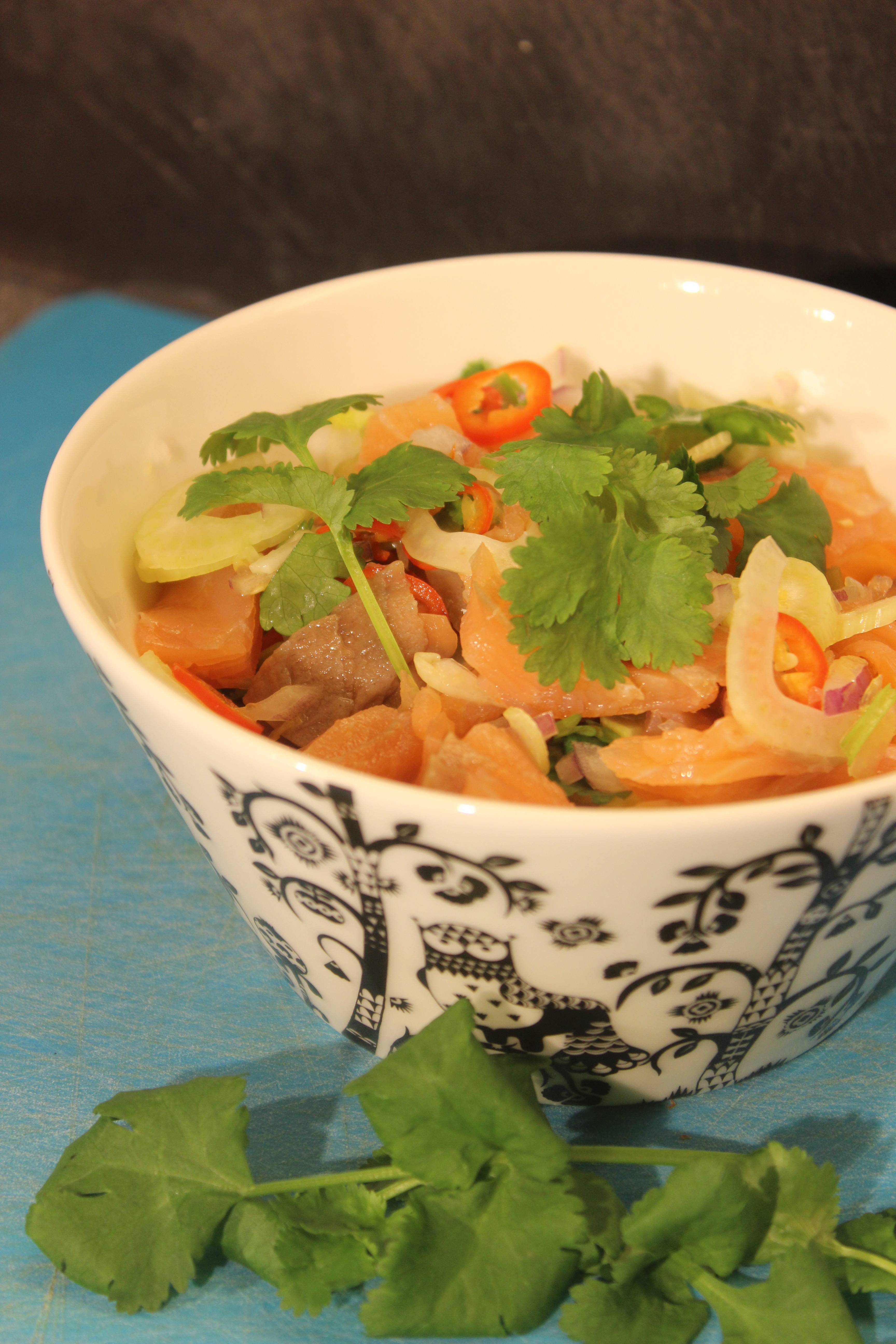 Kylmäsavulohiceviche (kahdelle alkupalaksi) 150g kylmäsavulohta (mieluiten palana, mutta viipaloitukin käy) 1 pienehkö punasipuli 1 pieni fenkoli 2 punaista chiliä 2 limetin mehu ja hedelmäliha 1 pienen appelsiinin mehu ja hedelmäliha ruukullinen korianteria silputtuna hyppysellinen suolaa