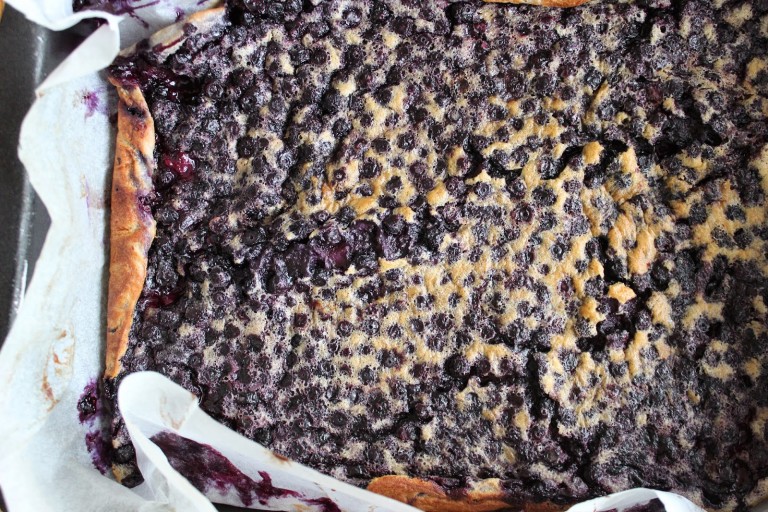 Ohjeen otin BBC Good Foodista, josta luin samalla, että vain kirsikoista tehtävä pannari on clafoutis, muilla marjoilla kyseessä on oikeastaan flaugnarde. Ettäs tiedätte. Manteleita ei kotona tällä kertaa ollut ja joku oli popsinut taas kaikki pähkinät, joten käytin taikinaan pelkkää vehnäjauhoa, jota laitoin hiukan alkuperäisohjetta isomman määrän. Marjoja ja mausteita muokkasin hieman myös. Hyvin toimi näinkin, vaikka hieman jäin miettimään, oliko ohjeessa kaikki määrät ihan kohdillaan; minä käytin esim. marjoja vain n. 250g ja niitä oli silti todella paljon taikinamäärään nähden, kuten kuvasta näkyy - eli lopputulos ei ollut niin kovin clafoutismainen. Alkuperäisohjeessa olisi marjoja ollut vielä 150g lisää. Aika moni olikin ohjeeseen kommentoinut, ettei annettu paistoaika riittänyt, minkä arvelen johtuneen marjojen suuresta määrästä. Ihan älyttömän hyvää siitä silti tuli, eli makua eivät marjat pilanneet mitenkään, vaikkeivät ne tehneet ulkonäölle palveluksia. Jos marjamäärää vähentäisi, vähentäisin myös sokeria, nyt pannari oli makeahko mutta se ei haitannut, kun raikkaita mustikoita oli mukana niin paljon. Pannarin jo tehtyäni muistin, että Luimupupulla olen myös nähnyt ihanankuuloisen, mustikkaisen clafoutis-pannarihybridin ohjeen, linkkasin senkin tähän.
