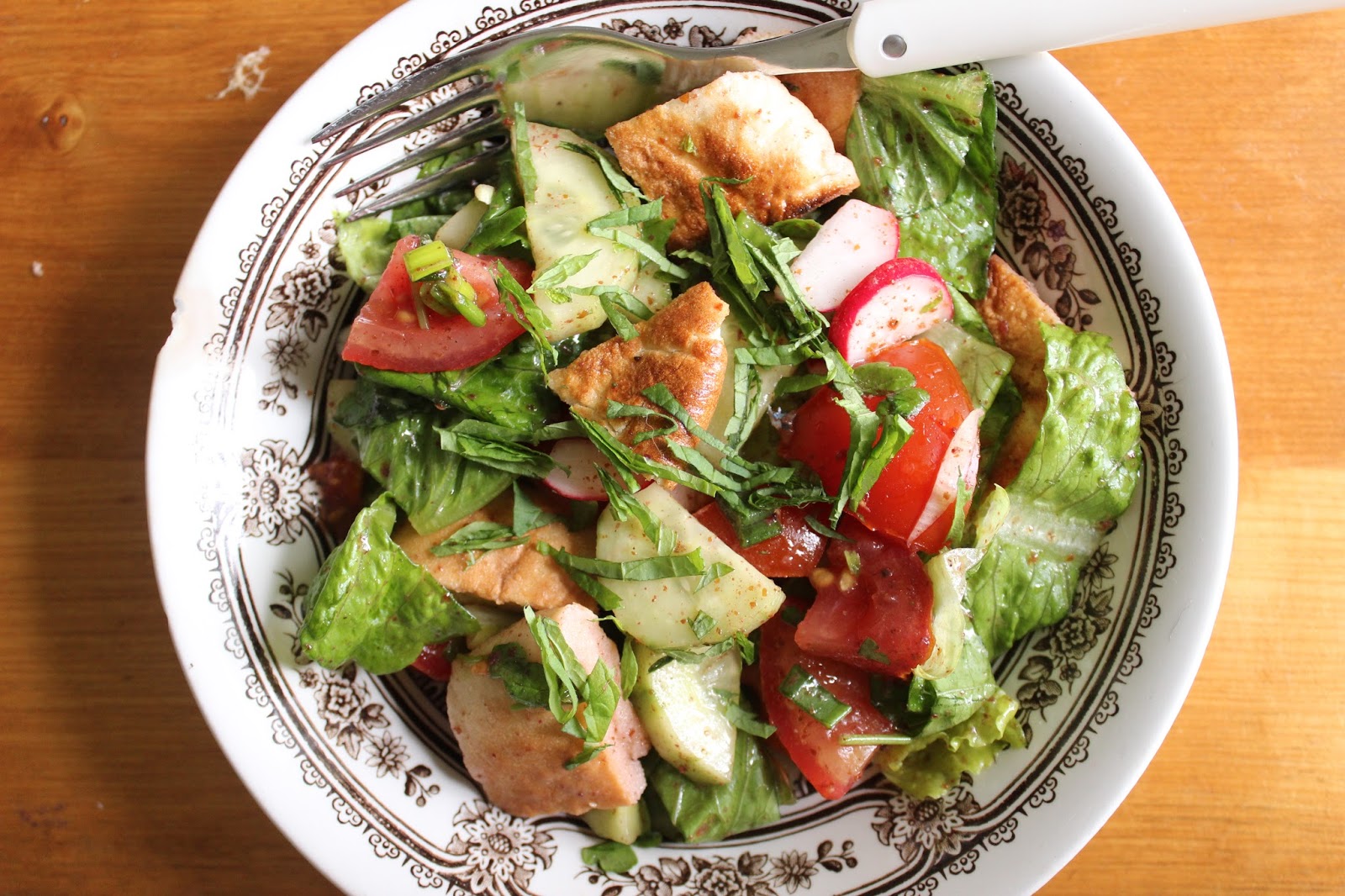 Fattoush on meilläkin melko hyvin tunnettu salaatti Lähi-idästä, mutta ihan kamalan taajaan ei ohjeita löydy suomalaisista lähteistä alueen tämänhetkisestä ruokabuumista huolimatta. Itse en ole sitä koskaan aiemmin tehnyt, mutta satuin lueskelemaan muutamia ohjeita etsiessäni erästä toista reseptiä, ja päätin sitten testata, koska fattoushia hehkutettiin niin monin superlatiivein. Ohjeita ja mielipiteitä oikeanlaisesta salaatista näyttää löytyvän yhtä monta kuin tekijöitäkin, yhden mielestä salaattiin kuuluvat ehdottomasti retiisit ja toisen mielestä ehdottomasti ei, moni puhuu libanonilaisesta salaatista ja joku taas sijoittaa alkuperän muille maille. Yhteistä kuitenkin kaikille versioille taisivat olla raikkaat, tuoreet kurkut ja makeat tomaatit, yrtit sekä paahdetut pitaleivän palat, jotka toimivat salaatissa samaan tapaan kuin krutongit.