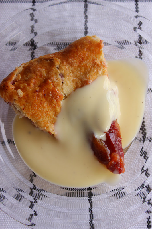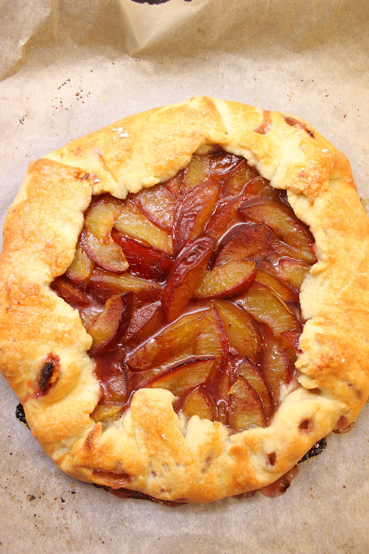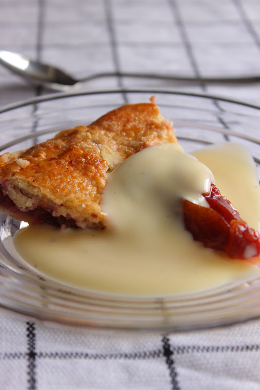 Pohjan resepti ja metodi löytyy täältä, ja muokkasin tähän ohjetta suomalaisiin mittoihin. Täytteeksi voi laittaa melkein mitä tahansa, minä laitoin luumuja ja sipaisin alle vähän vadelmahilloa taittamaan (hups, pikkuisen raakojen) luumujen happamuutta. Vaikeaa tämä ei ole, mutta taikina kannattaa kaulita melko vikkelästi, ettei se ehdi lämmetä ja notkistua niin, että se hajoaa siirrettäessä.