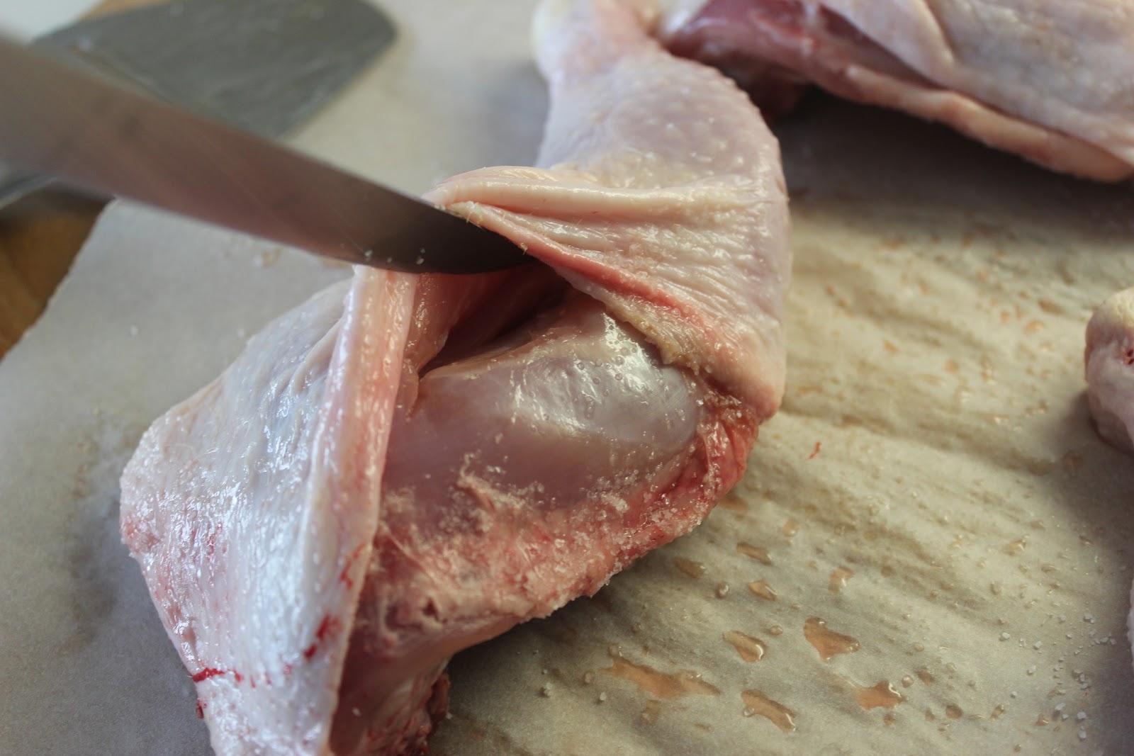 2. Leikkaa koipireiden reisiosaan tasku nahan alle luusta alaspäin. Hiero koipiin (myös nahan alle) suolaa. Lusikoi täyte taskuihin, ja jos taskutila loppuu kesken, muuten vaan nahan alle.