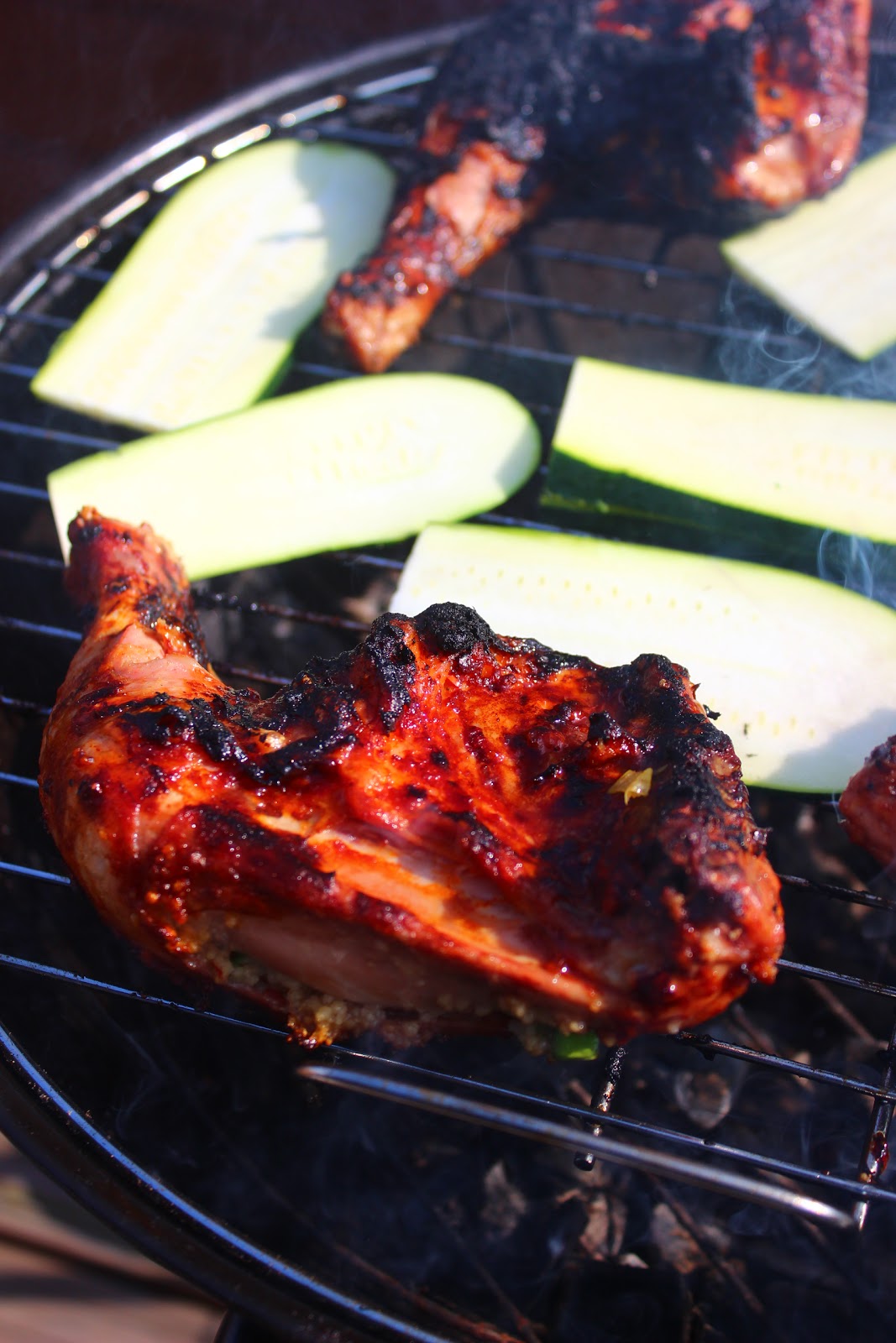 Grillin lämmönsäätely oli edelleen hieman haasteellista, kiitos erityisesti pallogrillipaketista puuttuneen mutterin, jolla kannen venttiili olisi ollut tarkoitus kiinnittää - kun jostain syystä kotonakaan ei ole jämämuttereita, grillaamme nyt ilman venttiiliä. Haasteista johtuen pintanahkaan tuli jälleen hieman ylimääräistä rapsakkuutta (lue: hiiltä), mutta itse koivista tuli loistavan meheviä, ja aurinkokin tuli sopivasti esiin grillitulia viritellessä :)