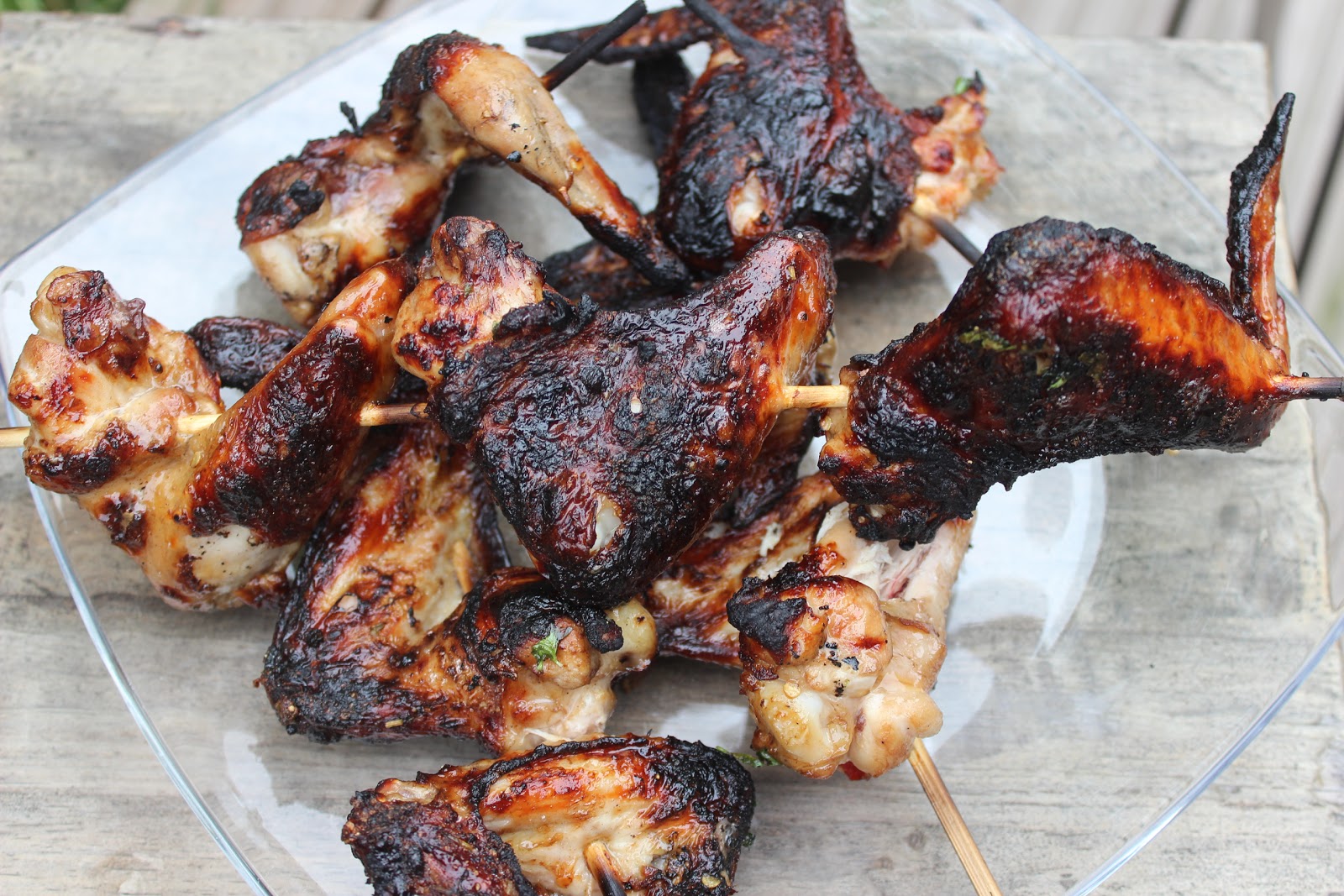 2. Ota siivet huoneenlämpöön vähintään 30 min ennen grillaamista ja pujota ne liotettuihin varrastikkuihin (esim. kolme siipeä/varras). Grillaa kuumassa grillissä molemmin puolin n. 15 min, tai kunnes siivet ovat pinnalta ruskistuneet ja sisältä kypsät (jolloin lihasnesteet juoksevat kirkkaina). Siipiä voi voidella esim. öljyllä tai omalla marinadillaan grillauksen aikana, mutta itse en niin tehnyt tällä kertaa, ja siipipalan oma rasva riitti silti pitämään nahan ja lihat mehukkaana.