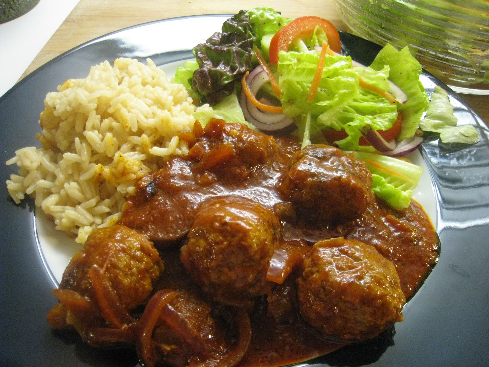 Kastikkeen pohjaksi kuullotin pannussa sipulin ja valkosipulin, jonka jälkeen sekoitin mukaan tomaattipyreen, sokerin, curryn ja juustokuminan. Lopuksi heitin lihapullat kastikkeen sekaan ja annoin niiden hautua kypsiksi 5-10 min.
