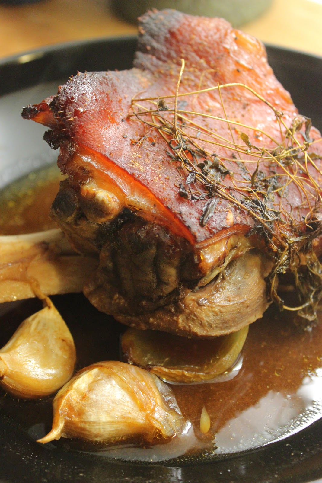 Onneksi ruokahuolto oli viikonloppuna harvinaisen helppoa. Puuhastelu possunpuolikkaan parissa jatkui taas viikonloppuna, nyt estradille pääsi potka. Se tuli meille puoliksi sahattuna, annospalaksi juuri sopivana kimpaleena. Olen viime aikoina usein haudutellut ylikypsät possunlihat liedellä kattilassa, joten vaihtelun vuoksi potkat pääsivät uuniin olut-tomaattiliemessä - ilahduttavan suurpiirteistä ruokaa! Laitoin potkat heti aamupäivästä uuniin, ja lähdimme sitten seisojan kanssa muutamaksi tunniksi lumihankeen peuhaamaan. Kotiin tultua oli vielä aikaa kotihommillekin, yhteensä ruoka viihtyi uunissa kuutisen tuntia. Liha oli suussasulavan pehmeää ja irtosi luusta melkein pelkän katseen voimasta. Ja edullistakin vielä!