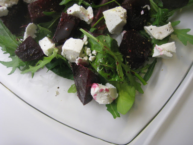 Tein jääkaapin pohjalle unohtuneille punajuurille nopean omenaviinietikka-hunajamarinadin, josta tulikin oikein hyvä yksinkertaisuudestaan huolimatta (tai ehkä juuri sen takia :). Tarkoitushan oli tehdä juurista jo viikonloppuna kasvispäällinen blineille, mutta toisin kävi. Siskoni blinikesteille - yksi ylensyöjän vuoden kohokohdista - lähtiessä juuret olivat edelleen raakana jääkaapissa. Sama pää ja niin edelleen, mutta onneksi toimi näinkin, juuret maistuivat vuohenjuustosalaatin komponenttina. Ja jos jotain jää yli, niin marinoidut punajuuret paranevat vanhetessaan.