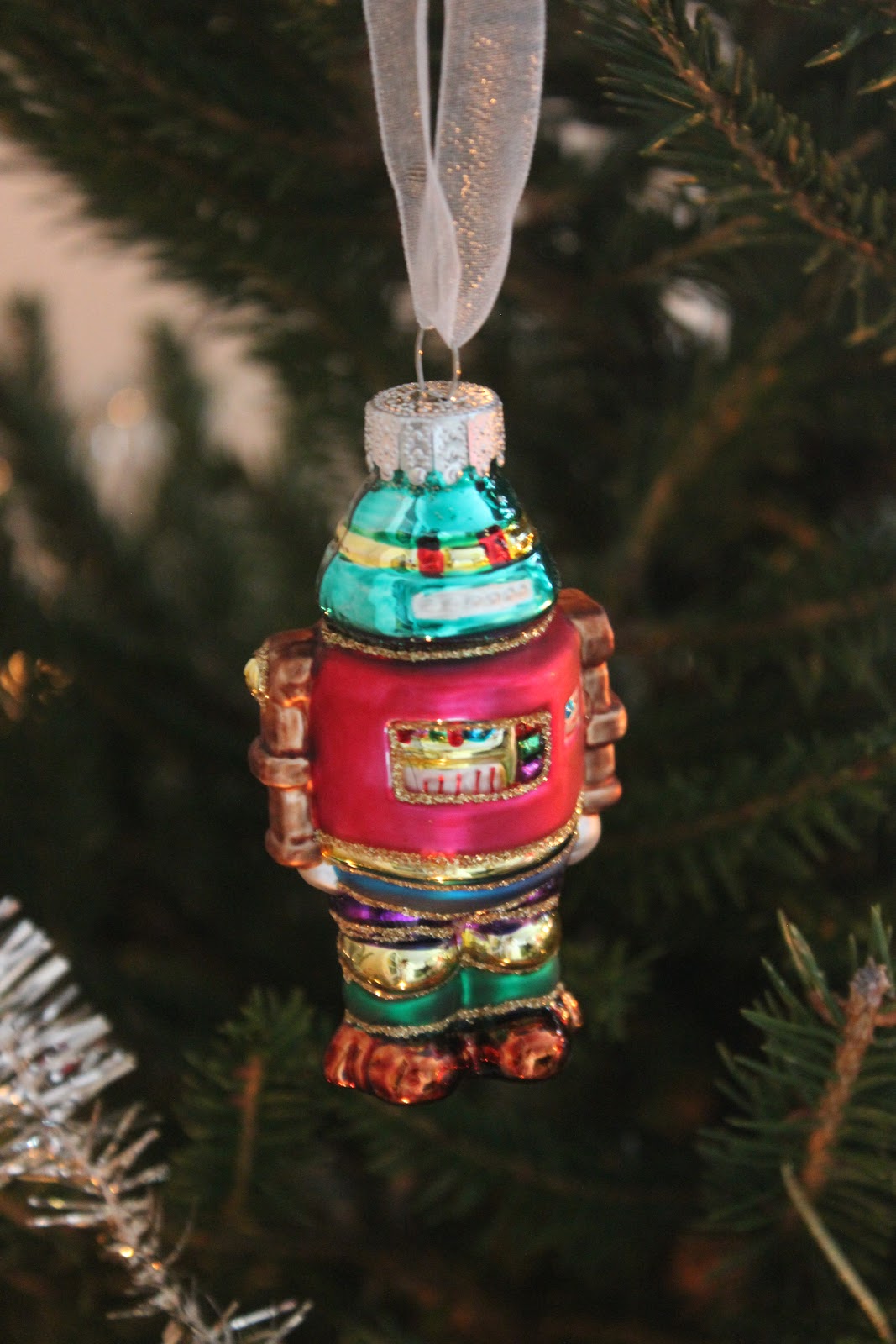 Harvoin hankin uusia joulukuusenkoristeita, mutta tänä vuonna en voinut vastustaa stockalta löytynyttä joulukuusenrobottia :D Reppana oli kaikenkirjavassa tyylissään piilotettu nurkimmaiseen joulukoristehyllyyn pois tyylikkäämpien koristeiden alta, enhän mä voinut sitä vastustaa.
