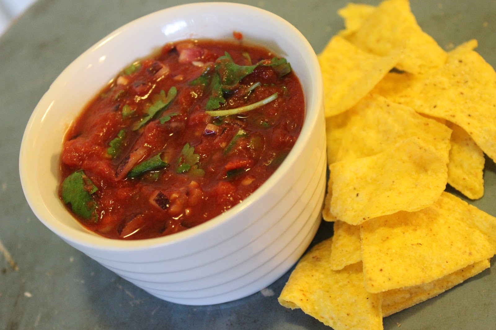 Ei, nyt ei puhuta tanssimisesta. Aika harvoin meillä syödään minkään sortin sipsejä, mutta taannoin isäntä toi kotiin ison pussin maissilastuja, kun satuin niitä johonkin tarvitsemaan. Koska omaan tarpeeseeni riitti noin kolme lastua, jäi meille aika paljon vielä syötäväksikin. Mutta voihan kriisi, mihin niitä dippaisi? Kysymyksen herätessä oli iltamyöhä, joten sopivan soosin piti syntyä kotikaappien aineksista ja mahdollisimman nopeasti. Vähän summamutikassa nappasin kaapista purkin tomaattimurskaa ja sekoittelin siihen mausteet, jotka arvelin toimiviksi. Arvaus osui tällä kertaa nappiin, miten siitä tulikin niin hyvää? Tosin salsa oli myöhemmin lähellä aiheuttaa perheriidan, kun isäntä oli syönyt minunkin osuuteni jämistä. Onneksi oli helppoa tehdä uusi annos.
