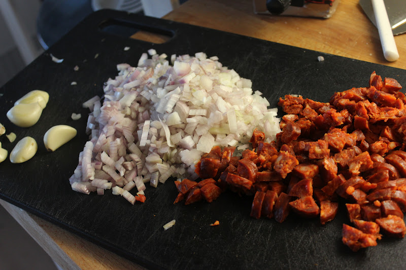1. Hienonna salottisipuli ja chorizo, ja silppua persilja. Kuori vielä valkosipulinkynnet ja jätä odottamaan pataan pääsyä.