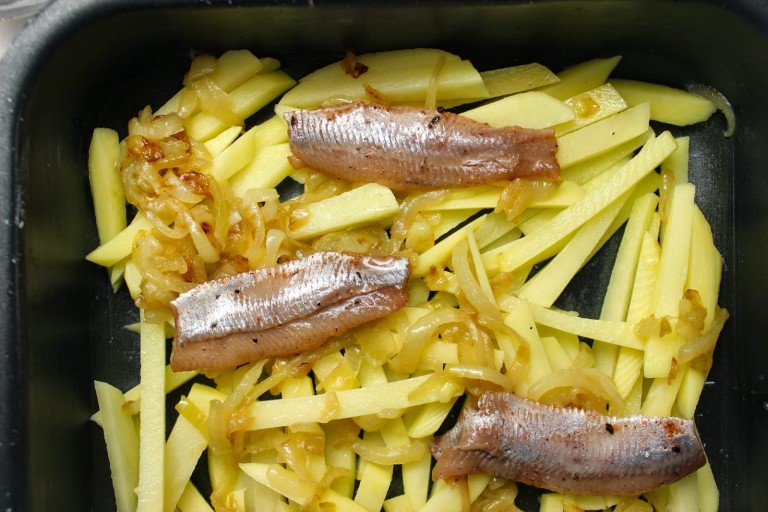 3. Voitele uunivuoka ja lado pohjalle kerros perunasuikaleita ja niiden päälle paistettua sipulia. Lado sitten päälle jansson-fileet (säästä liemi) ja päälle loput perunat ja sipulit (sekä halutessasi silputtua tilliä) niin, että vuoan päälle jää kerros perunaa. Kaada vuoan päälle kuohukerma ja liemi (voit myös sekoittaa ne keskenään ensin, mutta minusta suolaisuudesta tulee tasainen, vaikka ei sekoittaisikaan.