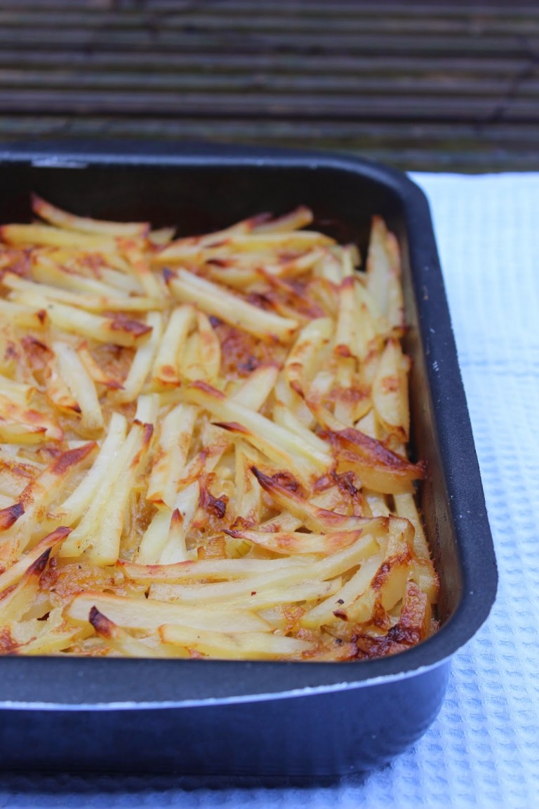 4. Paista 180-asteisessa uunissa noin 50 minuuttia, nosta lämpö sitten 200 asteeseen ja paista vielä noin 20 minuuttia tai kunnes päällimmäiset perunat saavat hieman kaunista väriä. Tarjoile raikkaan salaatin ja/tai etikkakurkkujen ja punajuurten kera.