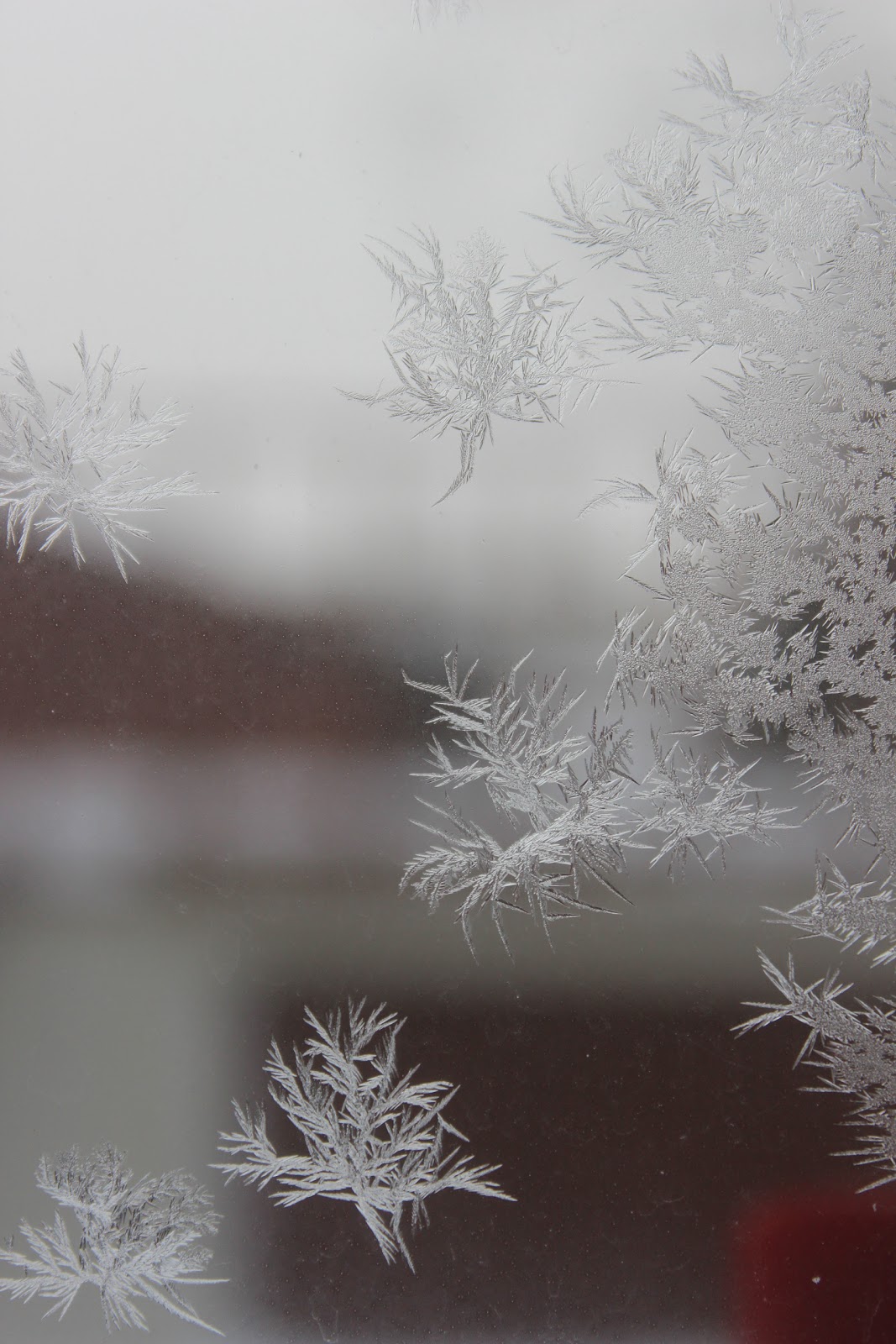 Joulukuun kunniaksi ikkunaan ilmestyi eilen kauniita jääkuvioita. Vielä kun olisin pessyt ikkunoita vähän ahkerammin… ;)