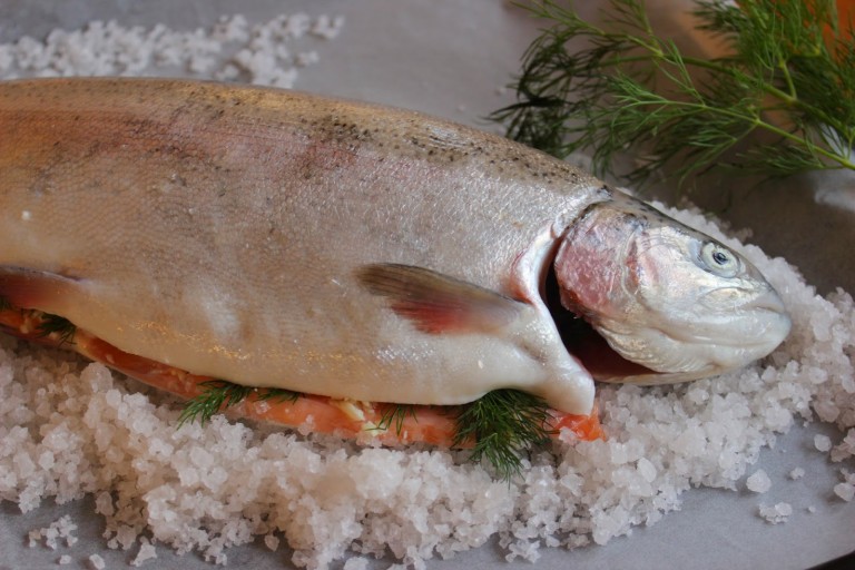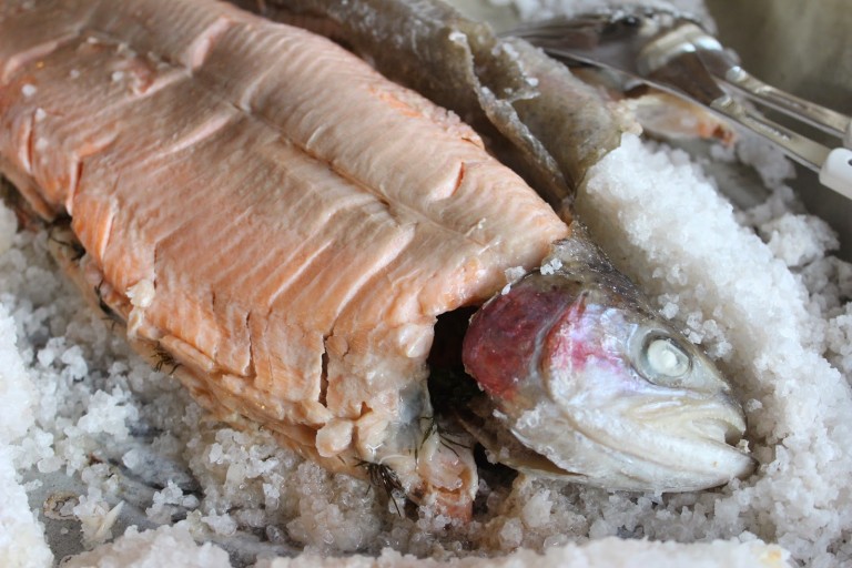 Kokonainen kala suolakuoressa