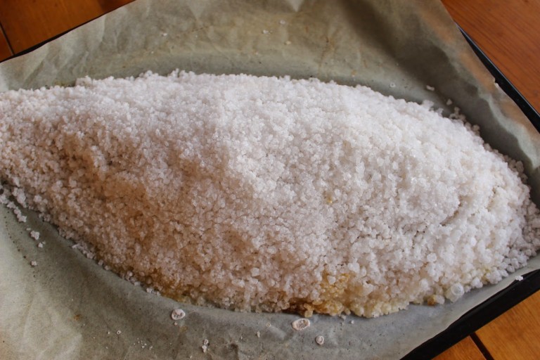 Ehkä viitisen vuotta sitten näitä suolakuoressa kypsennettyjen kalojen reseptejä näkyi paljon enemmän, mutta nyt trendit ovat taineet ajaa niistä ohi. Itsekin tajusin, että aiemmassa kodissamme tein suolakuorikalaa useaan otteeseen, mutta lienenkö tehnyt sitä täällä nykyisessä asunnossa kertaakaan, ja kohta olemme täälläkin asuneet jo neljä vuotta. Minulla syy ei ole kuitenkaan niin trendeissä, vaan enemmän siinä, ettei isäntä oikein välitä suolakuoressa tehdystä kalasta. Vaikkei hän ole erityisen ruotokammoinen, on kuulemma kokonaisen pienen kalan rääppiminen turhan työlästä siihen nähden, minkä verran siitä irtoaa tavaraa. Hmmm, outo mies. En kyllä yhtään allekirjoita hänen huoltaan, minusta suolakuoressa olevan kalan liha on mehevää ja putoaa luusta, ja voihan sitä tehdä vähän isommankin vonkaleen, jos siltä tuntuu. Ja koska isännältä ei ihan joka kerta kysytä, mitä hänelle saisi olla ruuaksi, innostuin nyt pitkästä aikaa laittamaan kalani suolakuoreen.