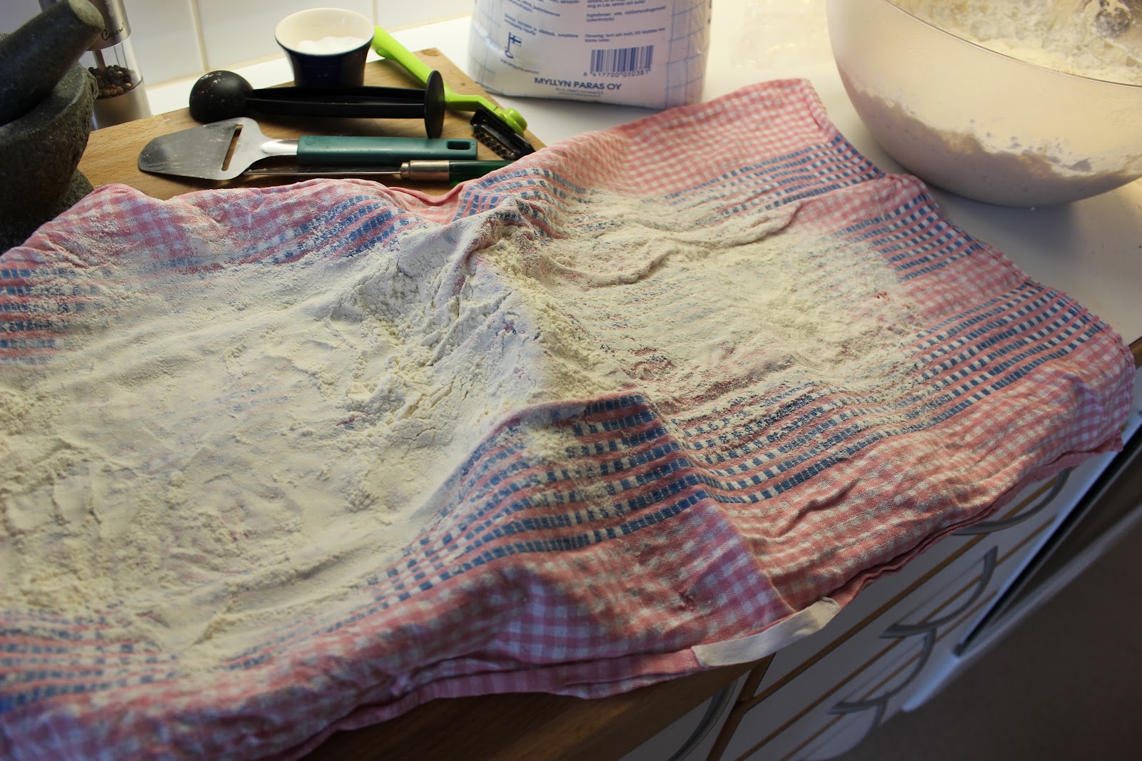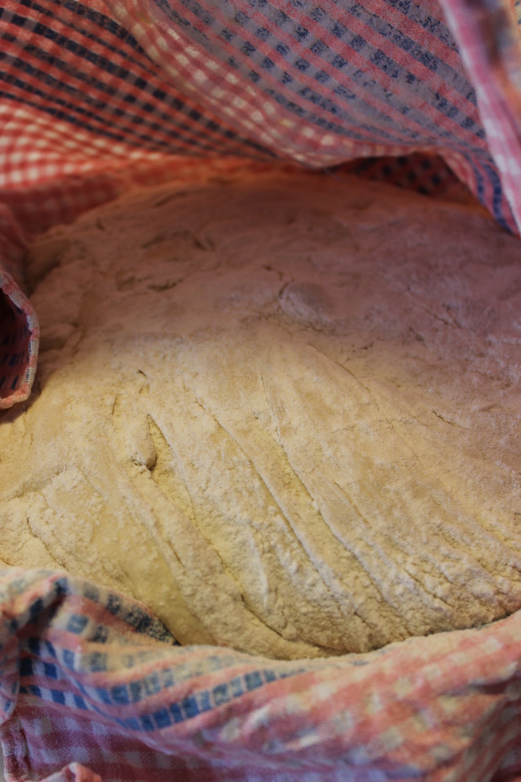 3. Laita korin tai syvän lautasen pohjalle liina ja ripottele sille reilusti vehnäjauhoja. Minä kääntelin liinaa, jotta saisin sen kauttaaltaan jauhotettua. Kaada taikina lulhosta koriin, ripottele päälle vielä jauhoja, peitä liinalla ja anna kohota 2 tuntia.