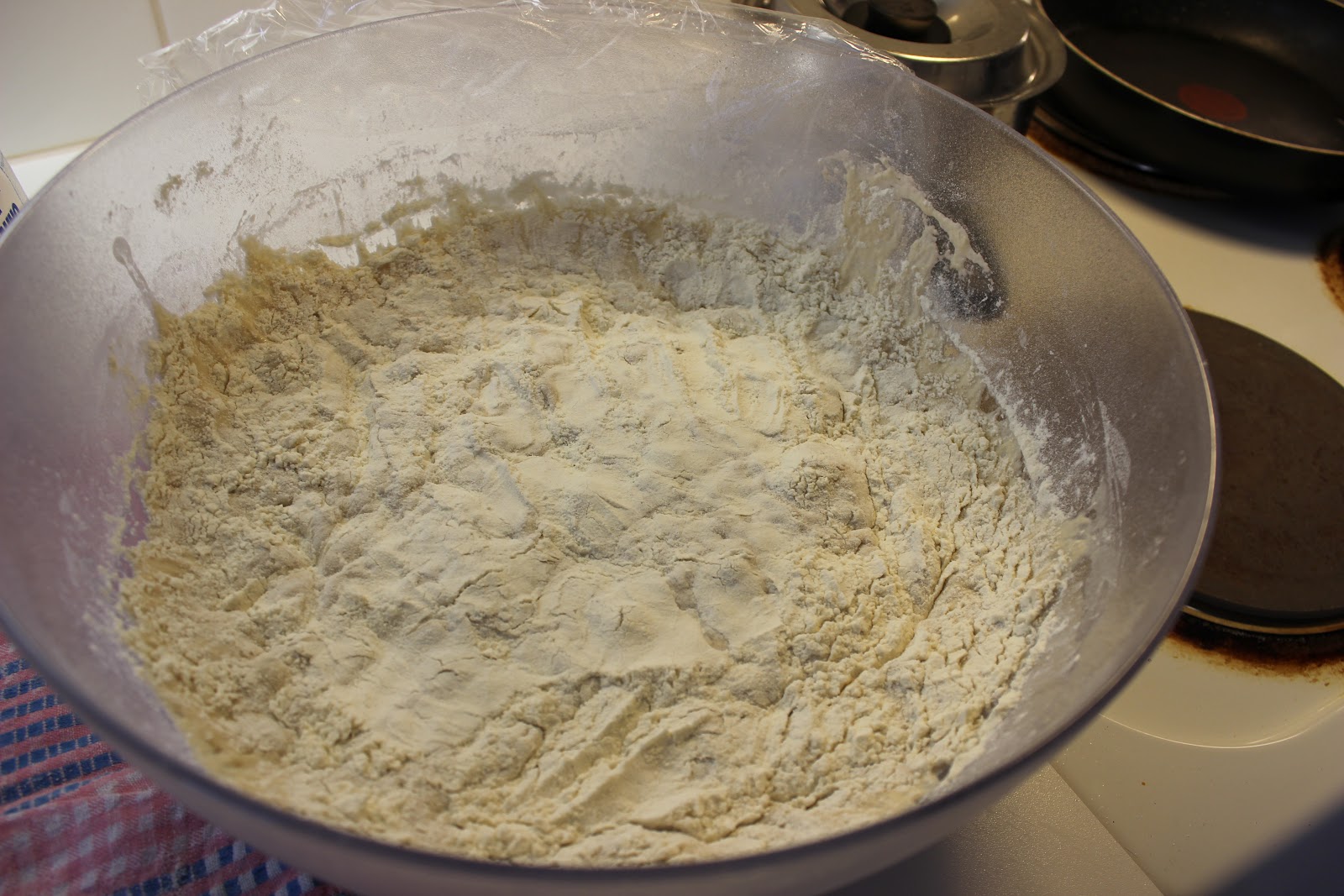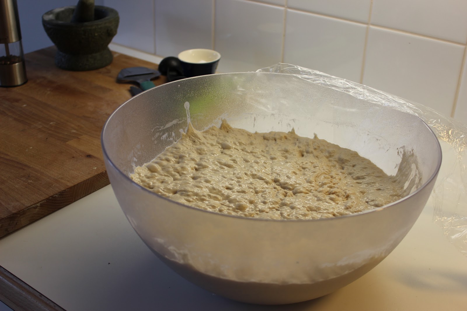 1. Sekoita siihen kuivat aineet keskenään mahdollisimman suuressa kulhossa. Sekoita kädenlämpöiseen veteen hiiva, jonka liuettua sekoita vesi-hiivaseos kuiviin aineisiin ja sekoita, älä vaivaa. Peitä kelmulla ja laita vedottomaan paikkaan kohoamaan 12-18 tunniksi.