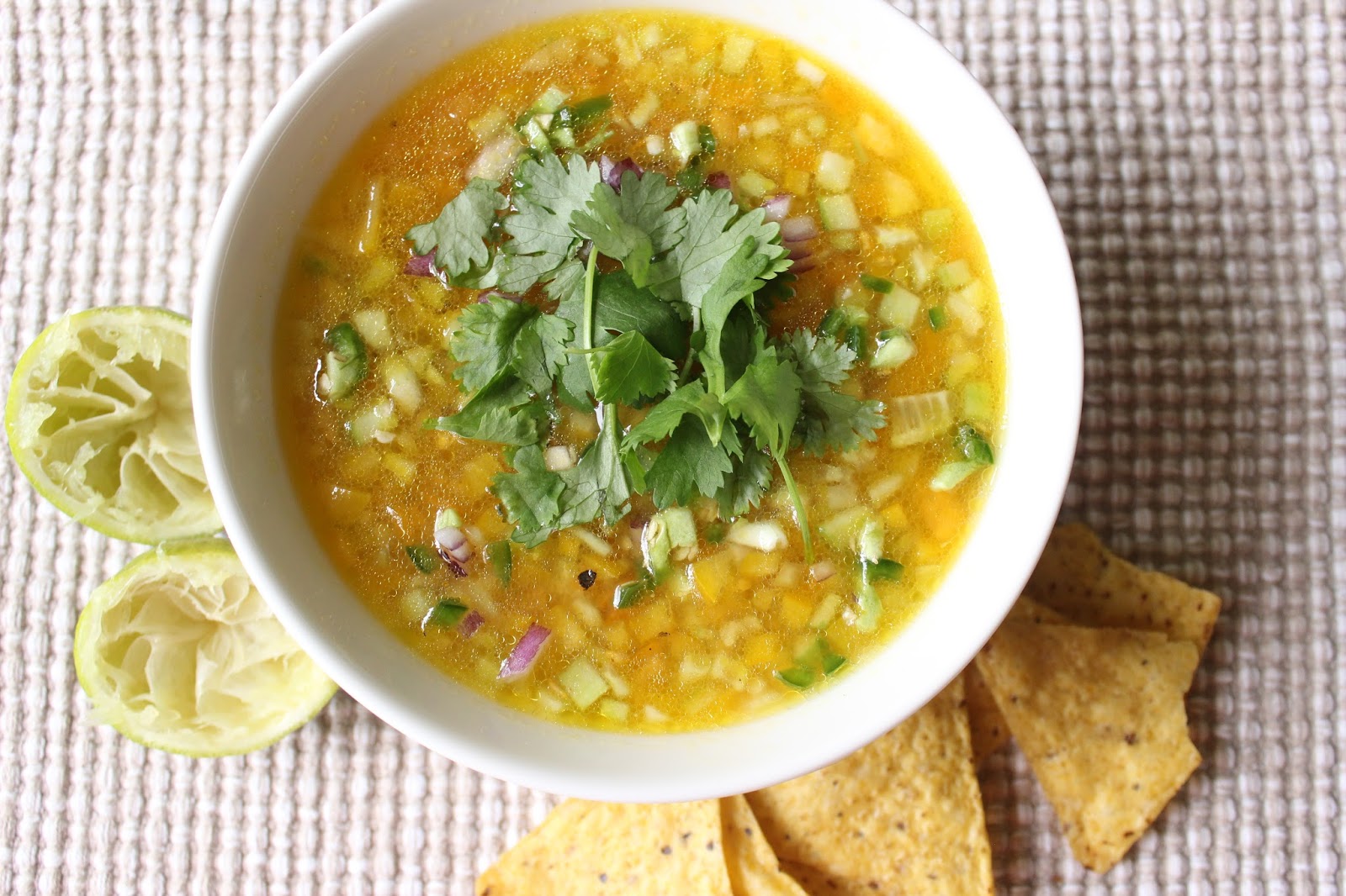 2. Sopan vetäytyessä hienonna jalapeno, punasipuli ja korianteri. Jaa keitto kulhoihin ja ripottele chili-sipuli-korianteriseos pintaan. Tarjoile esimerkiksi maissilastujen kanssa.