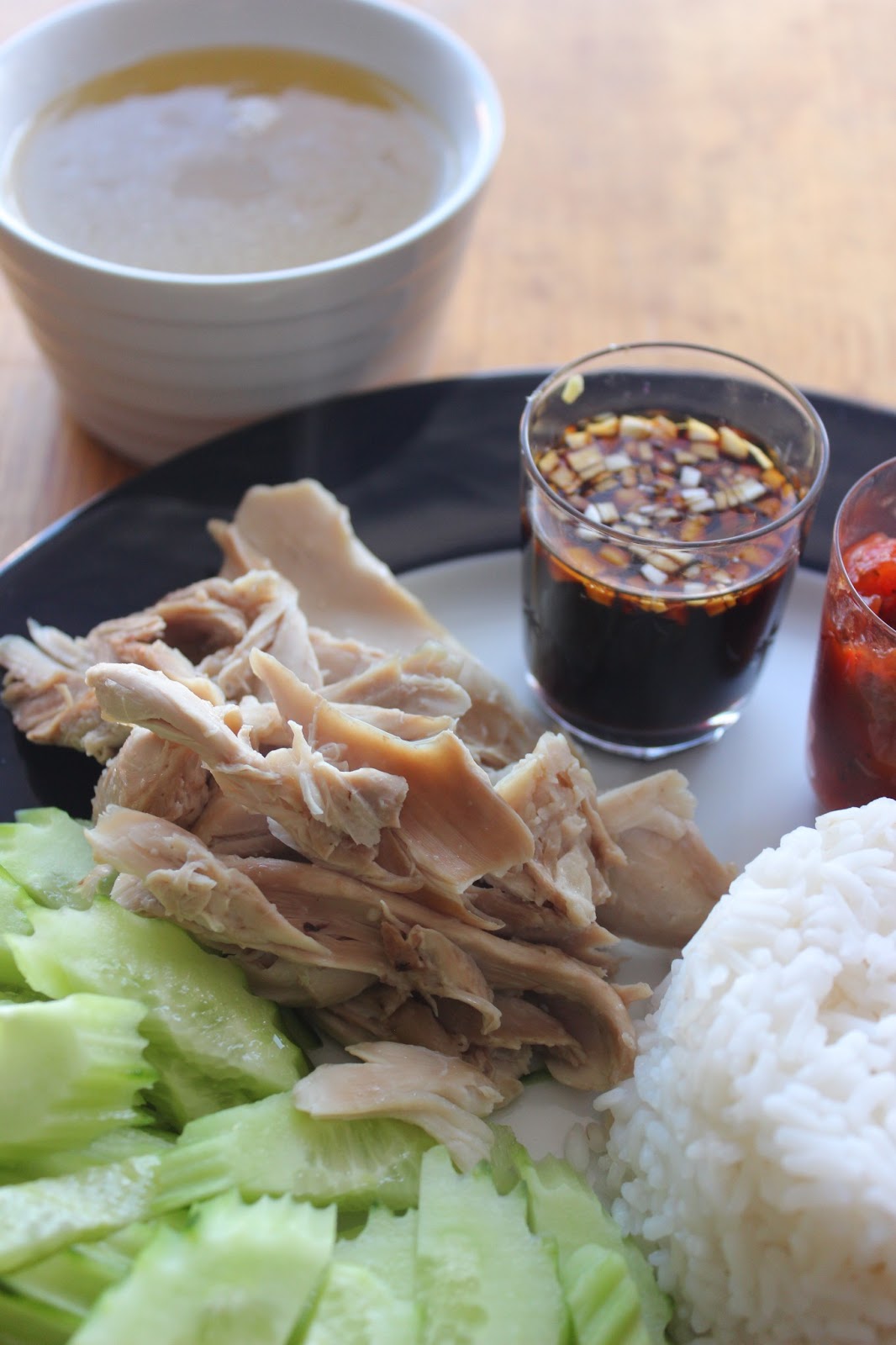 Matkakuumetta lääkitsemään - tai kenties villitsemään - kaivoin jääkaapista paketin maustamattomia broilerinkoipia. Olin ajatellut tehdä niistä jotain ihan muuta, mutta matkakuumeissani muutin mieleni ja tein mukaelman khao man kai:sta, yksinkertaisesta höyrytetystä kanasta riisin, liemen ja dippien kanssa. Kyseistä herkkua söimme useampaan otteeseen lounaaksi pienissä katukuppiloissa viitottuamme ensin ummikkoina tilauksemme ja oltuamme täysin pihalla siitä, mitä olisimme oikein saamassa. Eteemme kannettiin höyrytetty, viipaloitu kanan rintafile, riisiä ja erillinen kuppi kanalientä. Mukana tuotiin paria erilaista dippiä ja raikastuksena kurkkuviipaleita. Joskus annoksen mukana tuotiin myös pala kananmaksaa. Kovin yksinkertaista, mutta mukavaa näperreltävää. Ja hyvin, hyvin taloudellista sekä Thaimaassa että kotona tehtynä!