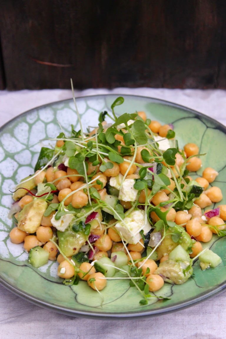 Ja salaateilla jatketaan. Kikherneistä ei ole vähään aikaan tullut tehtyä mitään, joten niitäkin oli nyt saatava. Lääkkeeksi edelleen kalvavaan salaatinhimoon kaivelin kaapeista valmiiksi löytyvistä aineksista sellaisen “mitä meillä nyt tänään sattuu olemaan” -tyylisen salaatin, josta tuli oikein maukas arkilounas, ja myöhemmin vielä päivällinenkin. Toisin kuin linssisalaatti, tämä salaatti ei valitettavasti ihmispoikaselle maistunut, hän maisteli raaka-aineita tyytyväisenä valmistusvaiheessa mutta lautaselta poimi vain muutaman kikherneen, puristeli sen jälkeen avokadonpalat käsissään muusiksi, tuuppasi lautasen kaikin voimin niin kauas edestään kuin mahdollista ja heitti lopuksi ruokalapun teatraalisesti perään. Ei väkisin. Minä kuitenkin pidin salaatista; kikherneet toivat siihen ruokaisuutta, kurkku ja sipuli mehevyyttä, avokado pehmeyttä, salaattisekoitus keväisyyttä ja feta mukavaa suolaisuutta. Harmi, ettei kaapissa ollut tomaatteja, niitä salaatti olisi ehkä vielä kaivannut. Helppoa ja (itselleni) maistuvaa arkiruokaa tästä tuli joka tapauksessa, ainut muistettava juttu on, että kikherneitä pitäisi liottaa kahdeksan tuntia ja keittääkin vielä tunnin - jos haluat salaattisi nopeammin, voi herneet ostaa purkissa käyttövalmiina. Menee joko sellaisenaan tai lisukkeena!