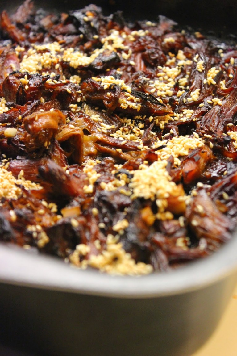 2. Irrota possunlavasta kamara, silavakerros ja luut, ja nyhdä liha kahdella haarukalla suikaleiksi. Sekoita kaikki kastikkeen ainekset seesaminsiemeniä lukuunottamatta, ja sekoita kastike vielä lihaan. Siirrä seos uuninkestävään vuokaan ja ripottele seesaminsiemenet päälle. Paista 175-asteisessa uunissa noin puoli tuntia.