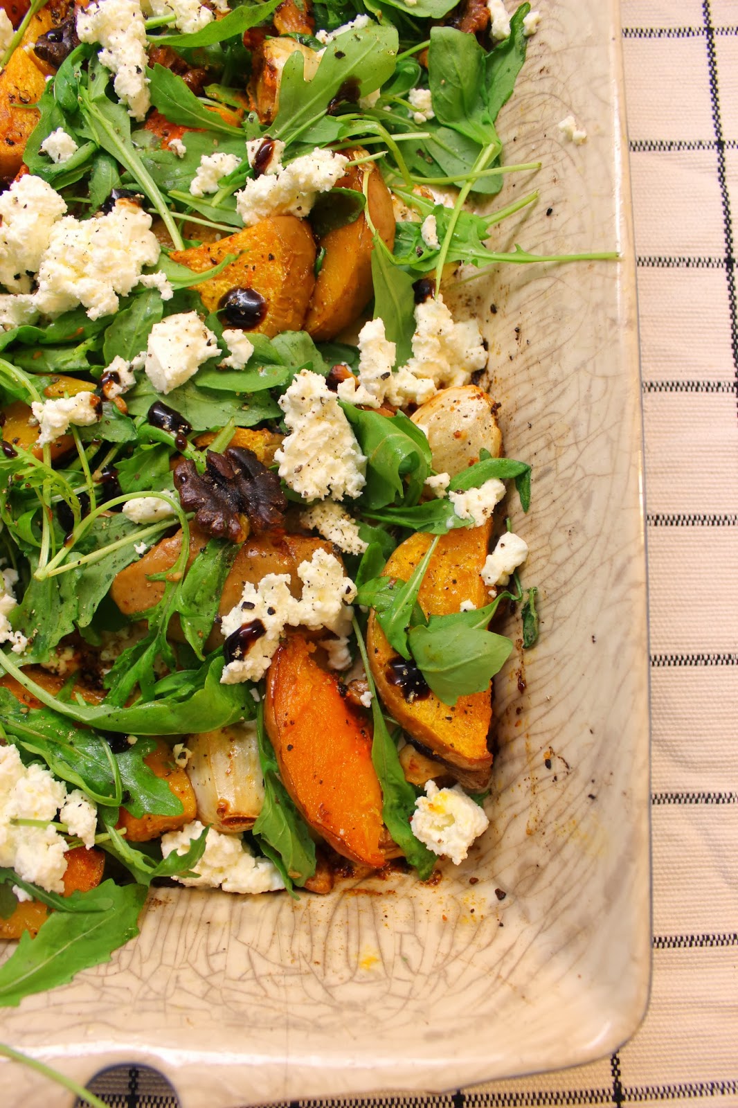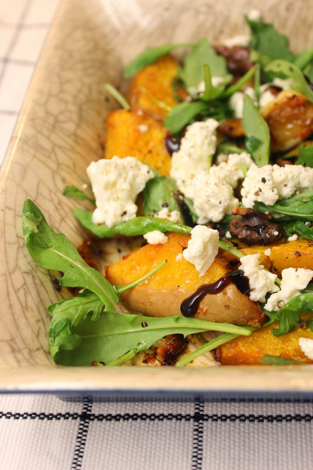 2. Murusta kurpitsaviipaleiden päälle feta ja nakkaa mukaan vielä rucola, ja pyöräytä kertaalleen ainekset sekaisin. Jos haluat, ripottele pinnalle esimerkiksi muutama tippa balsamicoa tai hunajaa.