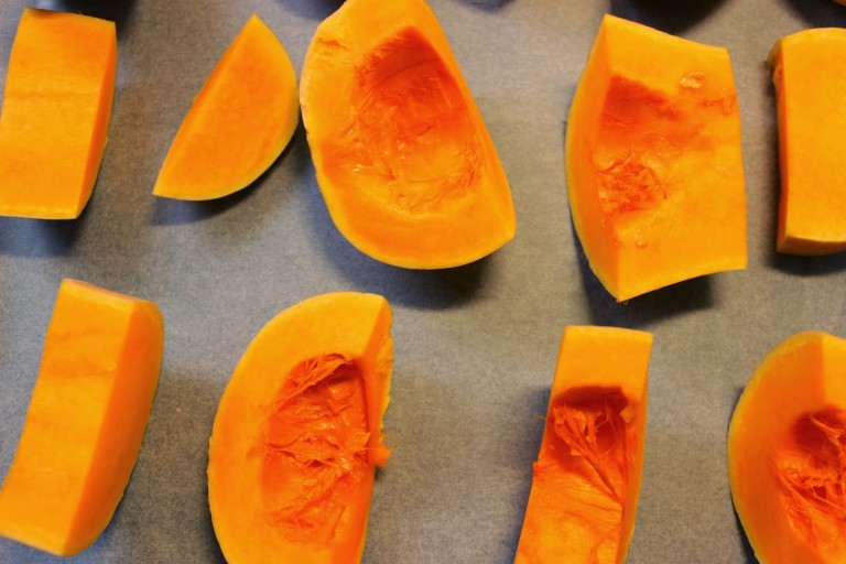 Kurpitsasosetta saattaa saada valmiina mutta minä tein sen nyt itse, se oli superhelppoa: (myski)kurpitsa lohkoina uuniin 225 asteeseen 20-30 minuutiksi (kunnes lohkot ovat pehmeitä), sitten kaavitaan liha irti kuoresta ja surautetaan sauvasekoittimella soseeksi ja annetaan jäähtyä.