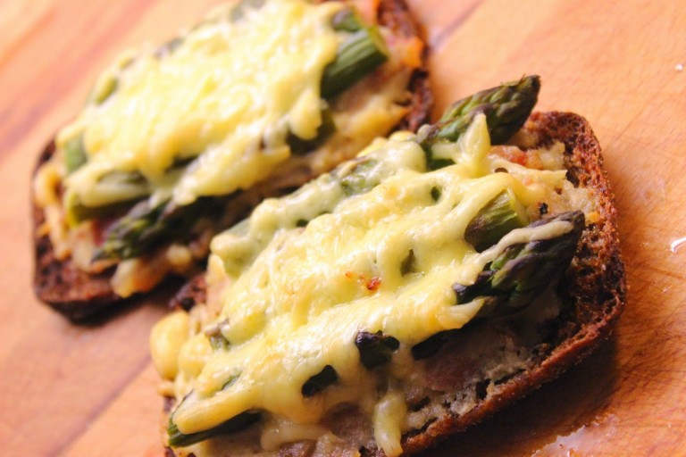 3. Laita uuni lämpiämään 180 asteeseen. Kasaa odotellesasi leivät; lado leivälle ensin parsat, lisää päälle nokare pekonikastiketta (jos vahingossa teet toisin päin kuten me, se ei haittaa :) ja viimeistele juustoraasteella. Paista 180-asteisessa uunissa, kunnes juustoraaste on sulanut ja kuplii hieman.