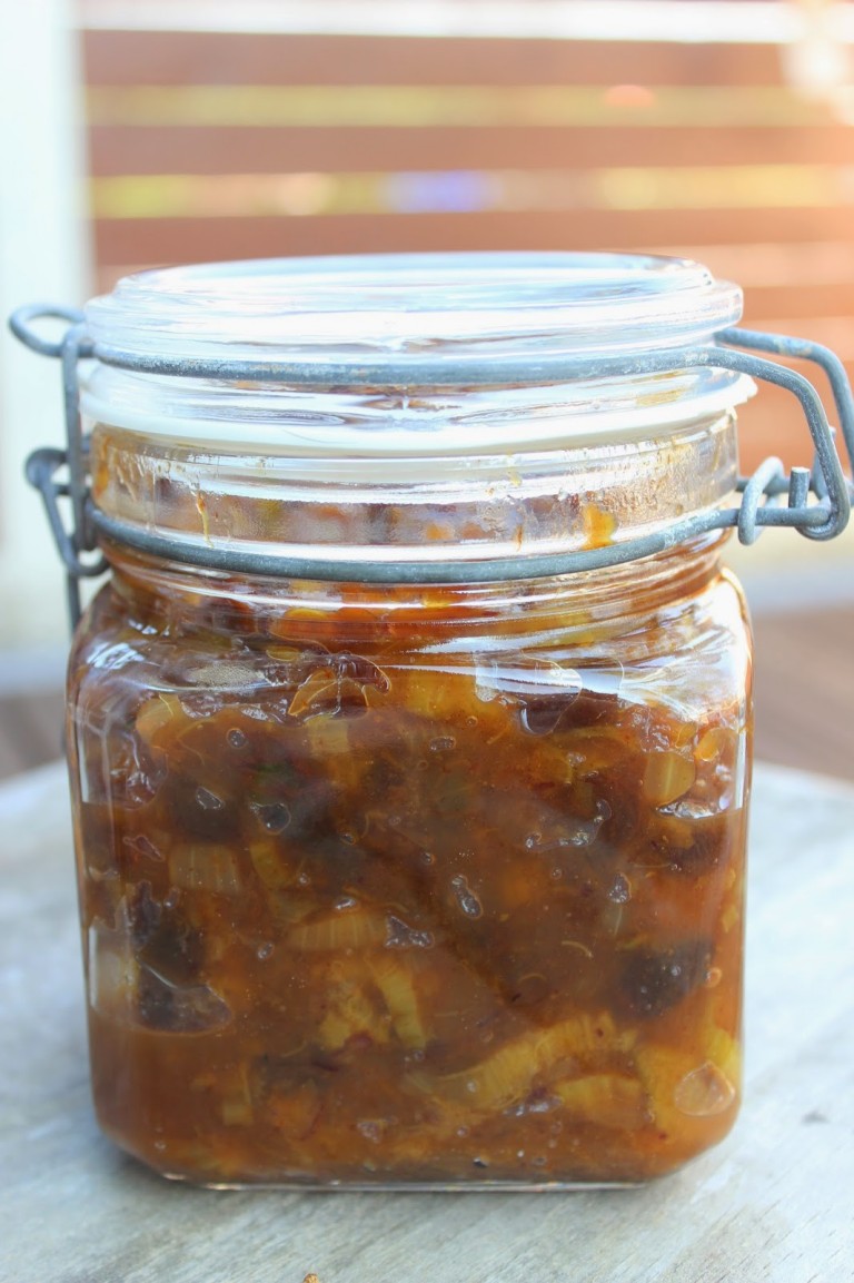 1. Kuori ja raasta omenat, kuori ja silppua sipuli, viipaloi raparperi ja hienonna taatelit. Desinfioi n. kuuden desin lasipurkki tai purkkeja pesemällä ne huolellisesti ja kuumentamalla hetken 125-asteisessa uunissa (tai keittämällä niitä muutama minuutti).