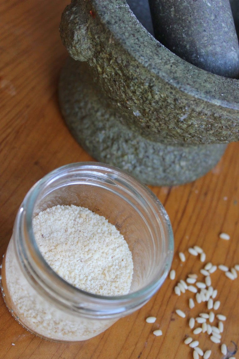 Lämmitä pannu miedolle keskilämmölle (minä laitoin 6-asteikollisella lieden ensin kolmoselle ja sitten kakkoselle). Kaada riisi kuivaan pannuun ja paahda miedolla lämmöllä noin puolen minuutin välein käännellen. Varo liian kovaa lämpötilaa, jolloin riisi saattaa ruskistua eli palaa ja muuttua kitkeräksi. Noin kymmenen minuutin kuluttua riisi alkaa hiljalleen saada vaaleanruskeaa sävyä paahtuessaan. Kun riisi on muuttunut vaaleanruskeaksi kauttaaltaan, se on tarpeeksi paahtunutta. Anna riisin jäähtyä ja jauha se hienoksi morttelissa pieni määrä kerrallaan, tai käytä esim. kahvimyllyä. Jauheen koostumus on sopiva, kun se on hieman kuivia mannaryynejä hienompaa.