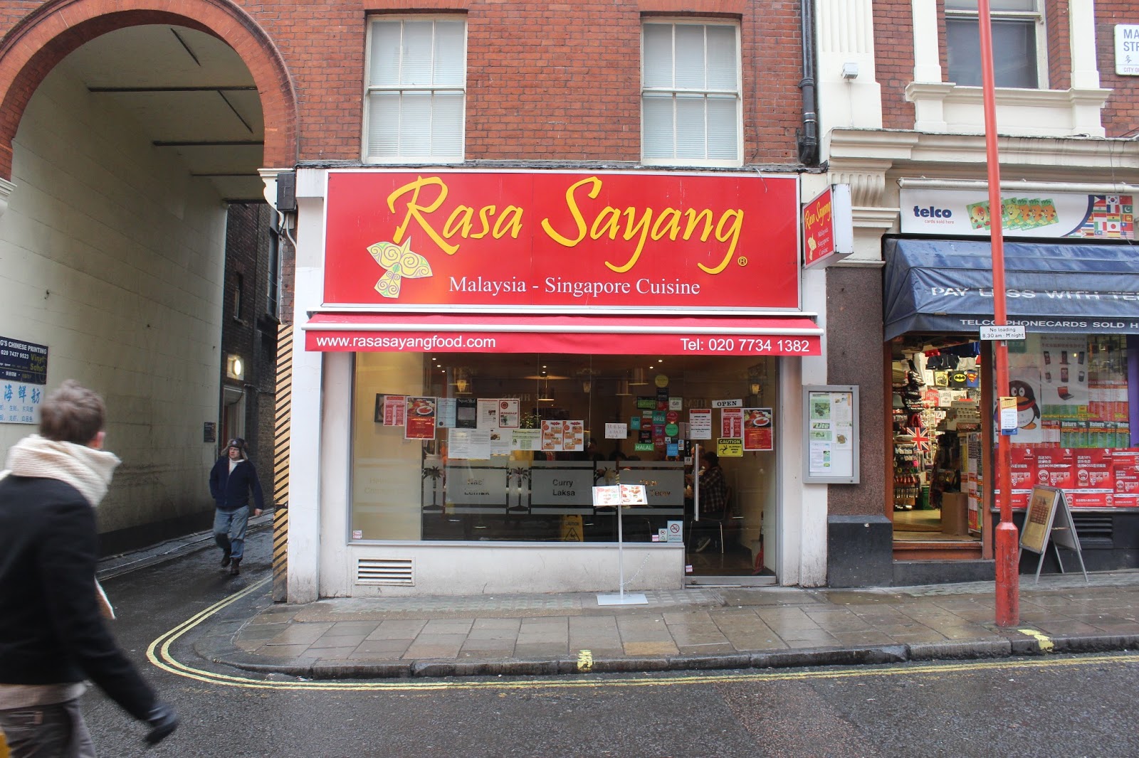 Singaporelais-malesialaista ruokaa tarjoileva Rasa Sayang sijaitsi Macclesfield Streetilla Chinatownissa. Olimme oikeastaan jo kävelleet vaatimattoman julkisivun ohi, kun isäntä kuuli jonkun takanamme kävelleen ohikulkijan kommentoivan, että ruoka on melkoisen mausteista. Jaa missä? Sinne! Sisustukseltaan paikka oli hyvin yksinkertainen mutta ihan siisti, ikkunassa käsinkirjoitettuja lippulappuja ja sisällä puiset ruokalamaiset pöydät ja kirkas valaistus. Lisäksi ravintolan alakerrassa oli hieman rauhallisemman näköistä istumatilaa, joka ei ollut lounasaikaan käytössä. Katutasossa asiakkaita kuitenkin riitti, pöydät olivat lähes koko ajan täynnä. Valitsimme listalta annoksen katkarapuja chilikastikkeessa, kanadumplingeja kirkkaassa liemessä, sekä kasvis-riisinuudeliannoksen. Katkaravut olivat herkulliset ja tulisuus lämmitti mukavasti, mutta dumplingit ja nuudelit vähän pliisut. Menisin siitä huolimatta uudemmankin kerran testaamaan, muiden ruokailijoiden ateriat näyttivät nimittäin ihan mahtavilta (vaikka minulla ei ole valokuvaa kuin ravintolan julkisivusta)! Hintaa pääruualle, riisille ja oluelle tuli n. 15 puntaa per henkilö, mikä oli mielestäni ihan kohtuullista.