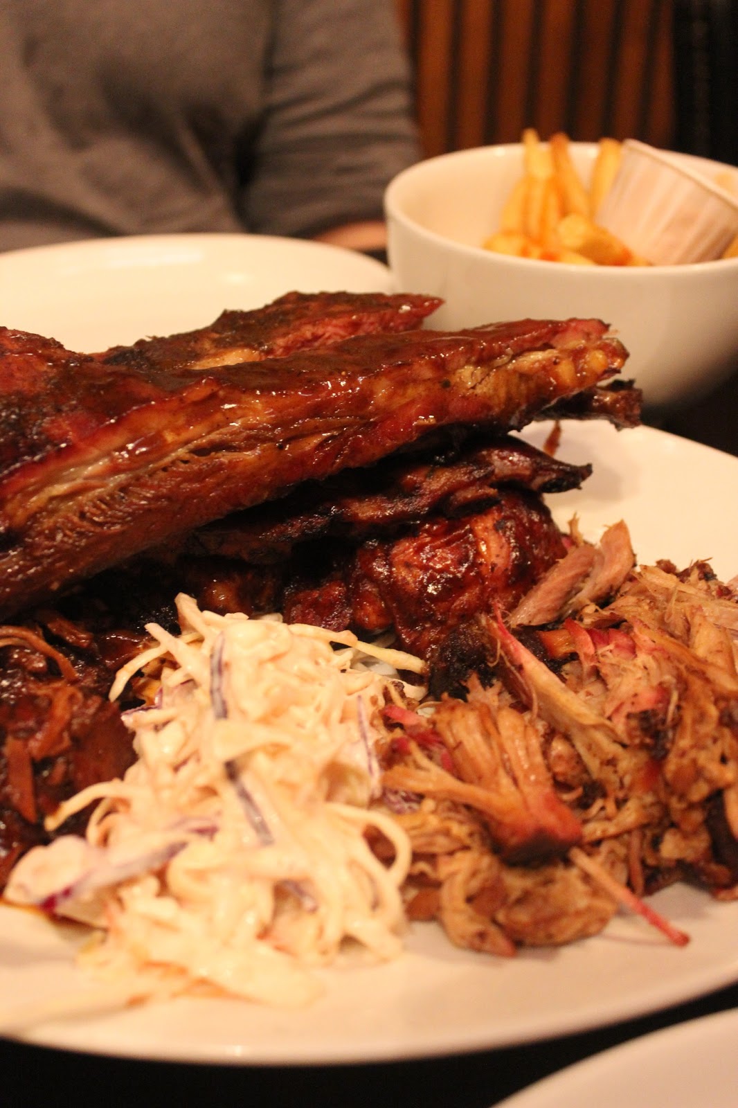 Poland ja D’Arblay -katujen kulmassa sijaitseva Bodean’s BBQ:n possukyltti veti meitä grillipitojen ja possunlihan ystäviä puoleensa :) Paikka ei ollut minulle tuttu, mutta Googlesta selvisi, että kyseessä on ketju, jolla on ainakin neljä ravintolaa Lontoossa. Meidän testaamassamme Sohon ravintolassa oli yläkerrassa yksinkertainen deli, ja alakerrassa varsinainen ravintola, jonka puolelle me suuntasimme. Konsepti oli kohdillaan, nautaa, possua ja kanaa grillistä asiankuuluvin lisukkein. Palvelu oli rennon ystävällistä mutta ripeää. Koska emme osanneet päättää, mitä söisimme, päädyimme ottamaan kahdelle tarkoitetun Bodean’s platterin, johon kuului viittä erilaista lihaa: kahdenlaisia possun ribsejä, brisketin “burnt ends” -paloja tahmeassa kastikkeessa, pulled porkia sekä kanan reisipaloja. Lisänä annoksessa oli coleslawia ja ranskalaiset. Hyvä kokonaisuus paperilla, mutta vähän epätasaiseksi jäi yhteensä n. 35 punnan hintaan kahdelta. Nauta ja kana lunastivat lupauksensa, ja varsinkin brisket (mitähän se on suomeksi?) oli herkullista. Possu jätti kuitenkin vähän kylmäksi, lieneekö osittain sitä, että on jo itse tehnyt aika monet hyvin onnistuneet ribsit ja pulled porkit, joten niiltä odottaa ravintolassa aika paljon. Osittain oli kyse kuitenkin myös ihan vaan rehellisistä mokista, kuten liian kylmänä tarjoiltavasta ruuasta. Jos olet suuri barbequen ystävä, kävisin testaamassa, mutta jos et, niin valitsisin ehkä viereisen kuppilan. Possun ystävällekin suosittelisin mieluummin esim. Oinkia Edinburghissa, siellä oltiin paremmin asian ytimessä ;) Meidän kokemukset löytyvät täältä. Hyvästä palvelusta kuitenkin Bodean’s BBQ:llekin pisteitä!