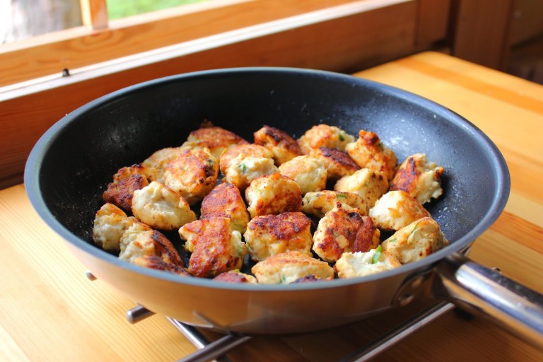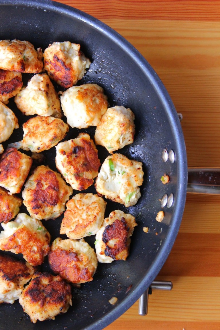 2. Muotoile taikinasta pullia esim. kahden teelusikan avulla (käsinkin voi tehdä, mutta taikina on niin tarttuvaista, että minusta lusikalla oli helpompi operoida). Paista pullia paistinpannulla keskilämmöllä voi-öljyseoksessa molemmilta puolilta muutama minuutti, kunnes ne ovat kauniin ruskeat. Ota pannu pois levyltä, laita kansi päälle ja anna pullien vetäytyä vielä muutama minuutti ennen tarjoilua.