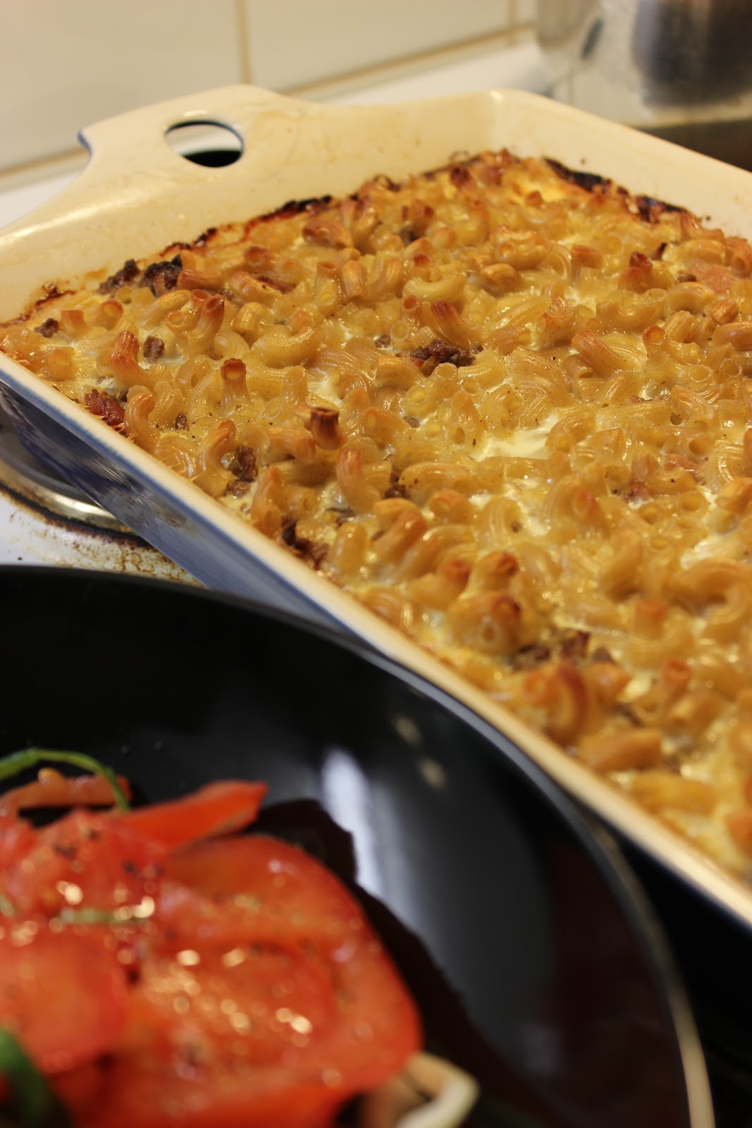 Viikonloppuna tuli kuitenkin pitkästä aikaa ihan perinteisen, twistittömän makaronilaatikon himo. Koska aineet ovat melkein aina jääkaapissa, pääsin samoin tein antamaan mieliteolle periksi (ei, mulla ei ole selkärankaa ;). Ainut poikkeama ns. perusversiosta oli se, että laitoin mukaan pekonia, koska jääkaapissa ei ollut sikanautaa, vaan pelkästään naudan paistijauhelihaa. Pitää makaronilaatikossa possua ja rasvaa olla.