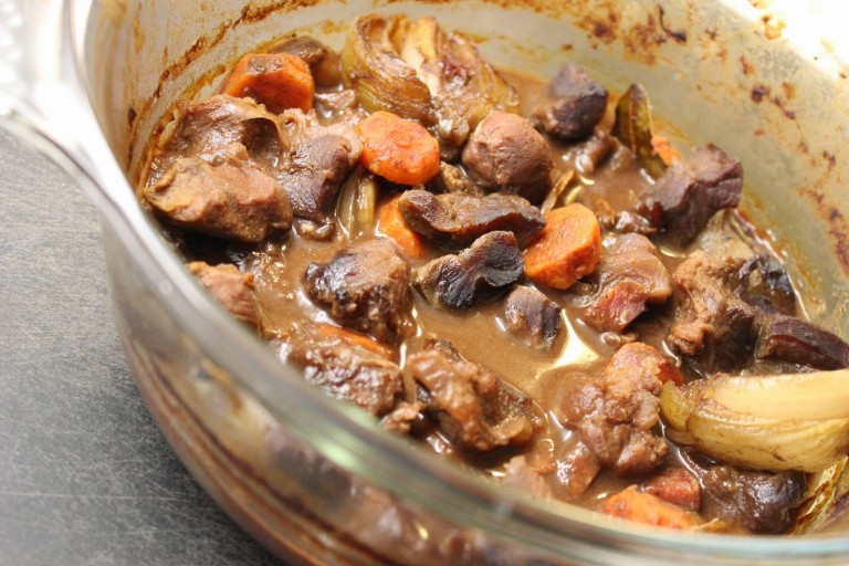 Vuoan reunasta näkee, että nestettä haihtuu runsaasti. Liemestä esiin pilkistävät lihat ottavat hieman väriä, mutta pysyvät silti ihanan mureina ja mehevinä, kun niitä muistaa välillä käännellä.