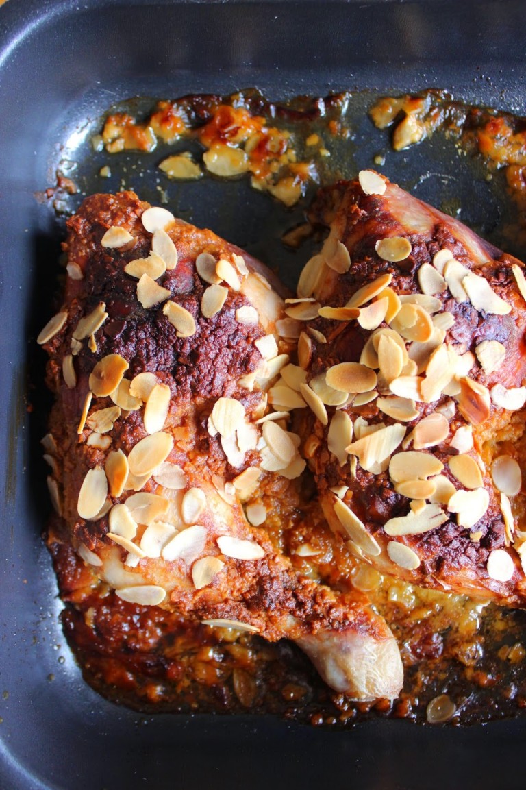 2. Ota koipireiden huoneenlämpöön ja hiero nahan alle suolaa. Hiero kuorrute pintaan ja laita linnut uuninkestävään vuokaan. Lusikoi mahdollinen ylimääräinen kuorrute kanojen päälle ja ripottele halutessasi pintaan mantelilastuja. Paista 175-asteisessa uunissa reilun tunnin ajan, kunnes lihasnesteet juoksevat kirkkaina (huom. jos käytät jotain muuta palaa kuin koipireisiä, suosittelen tarkistamaan paistoajan). Lisää tarvittaessa n. desilitra vettä vuoan pohjalle, jos näyttää, että kuorrute palaisi vuokaan kiinni. Minulla oli hieman erikokoisia koipia, pienimmälle olisi riittänyt tunnin paisto, suurin kaipasi kuitenkin tunti 15 min uunitusta. Uunin lämpötila oli kuitenkin sikäli hyvä, että pieninkin koipi pysyi mehevänä.