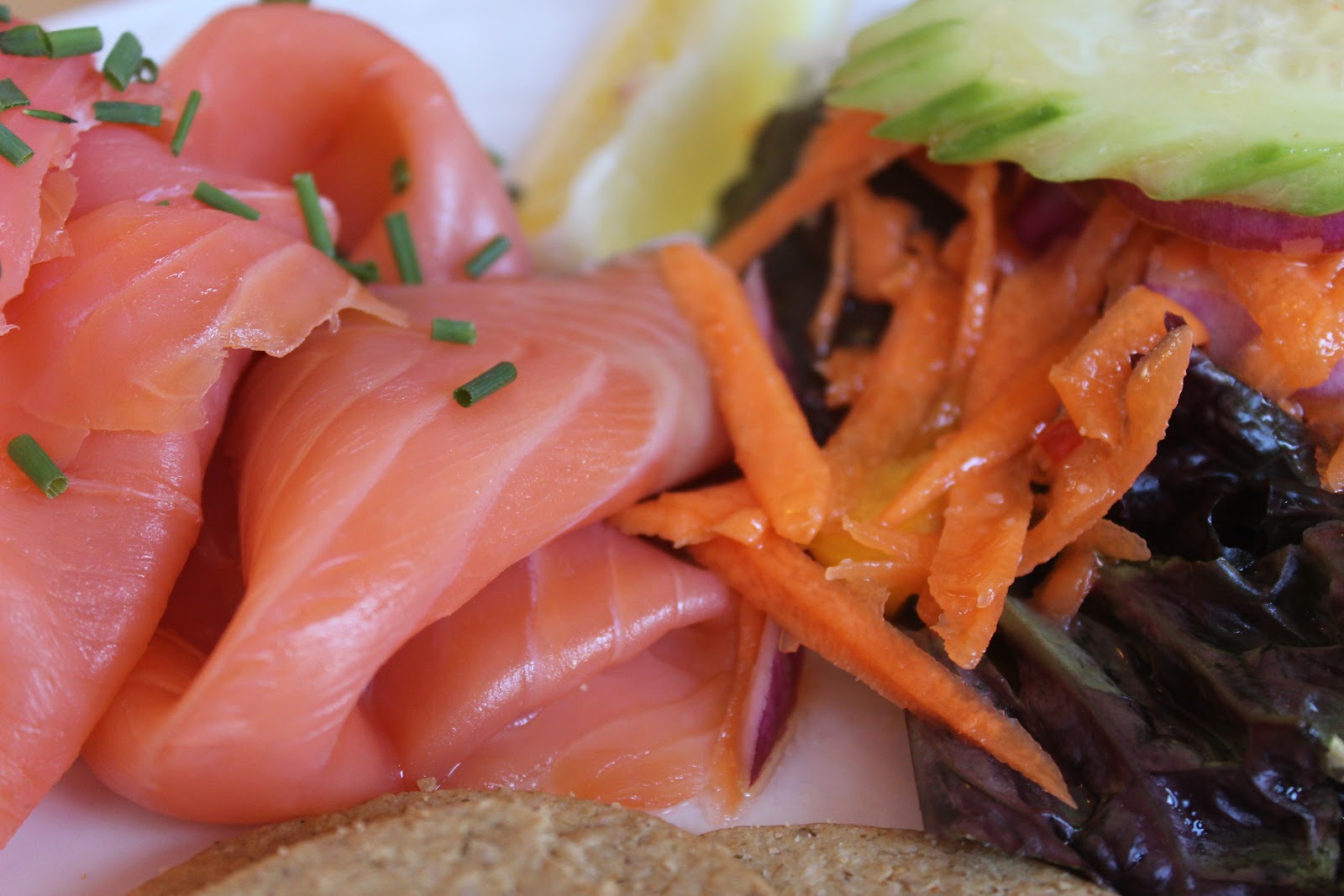 Alkuruuista cullen skink olisi mennyt pääruokana jo yksinään, savustettua koljaa, perunaa ja porkkanaa oli kermaisessa liemessään valtava vadillinen. Annos oli myös oiva muistuttaja siitä, miten uskomattoman hyvää yksinkertaiset asiat ovat :) Minun kylmäsavuloheni oli myös erittäin herkullista ja sitäkin oli paljon. Savun maku oli voimakkaampi kuin yleensä kotipuolessa, tamminen ja viskistä muistuttava. Lohi oli kuitenkin pehmeän raikasta, kaukana vakuumipakkausten rasvaa hikoilevista viipaleista. Ainut mitä en ihan tajunnut, olivat lohen kanssa tarjottavat suolaiset kaurakeksit, ne jäivätkin lopulta suurimmaksi osaksi lautaselle.