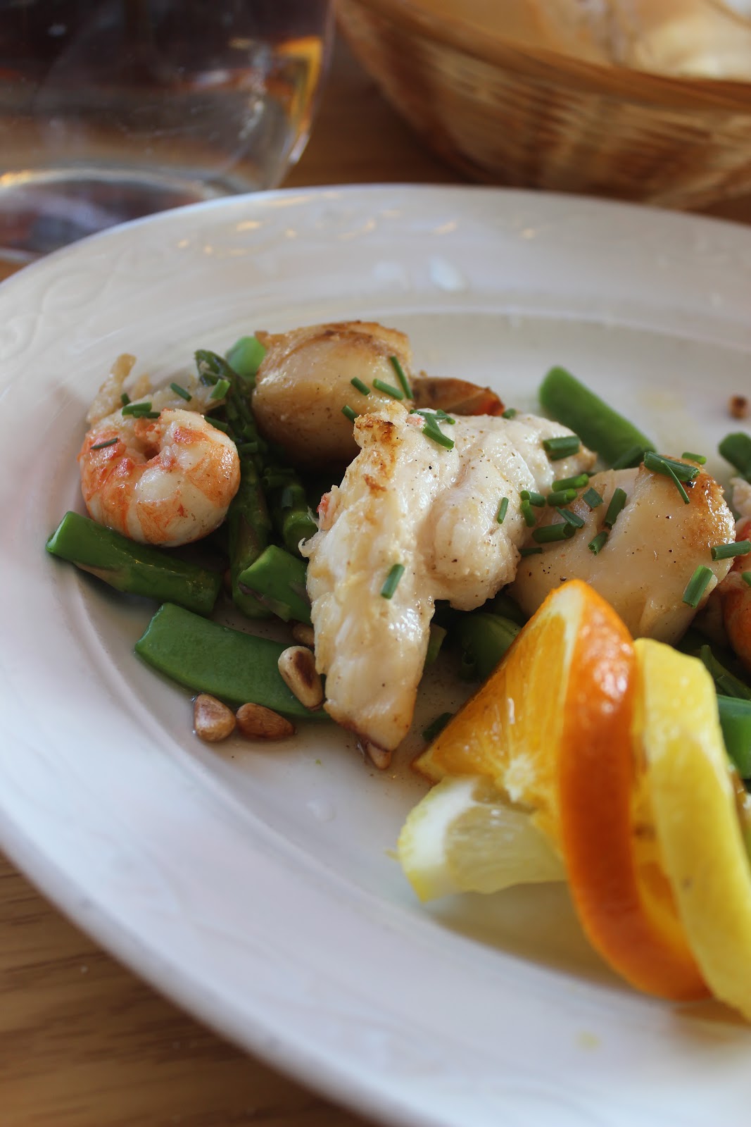 Pääruuista ei myöskään löytynyt juuri moitittavaa. Asiaa sen tarkemmin tuntematta arvioisin lasikampelan olevan ns. halpakala (ainakin ruokalistalla se oli halvemmasta päästä), ruotoja löytyi jonkin verran mutta liha oli helppo perata niistä irti. Kalan maku oli kuitenkin jälleen ihanan raikas ja kypsyys täydellinen, söin yksinkertaisesti sitruksilla ja yrteillä maustetun otuksen nahkoineen päivineen. Isännän annoksesta erityisesti kampasimpukat ansaitsevat maininnan, olen aiemmin syönyt kyseistä raaka-ainetta lähinnä pakasteesta tulleena ja kumipallomaisena (enkä sen vuoksi ole ikinä siitä erityisemmin innostunut), mutta nyt maku oli tuoreen raikas ja kypsennys mitä mainioin. Pääruokien ohella tarjoiltiin uusia perunoita ja vihanneksia voin kera. Tämän lounaan kustannus oli hieman korkeampi, noin 50 punnan hujakoilla kahdelta hengeltä, mutta mielestäni rahalle sai myös vastinetta, kaksi alkuruokaa, kaksi pääruokaa ja kaksi olutta, kaikki herkullisia (myös oluet ;). Notkuimme ravintolan ovesta ulos vatsat onnellisen täysinä.