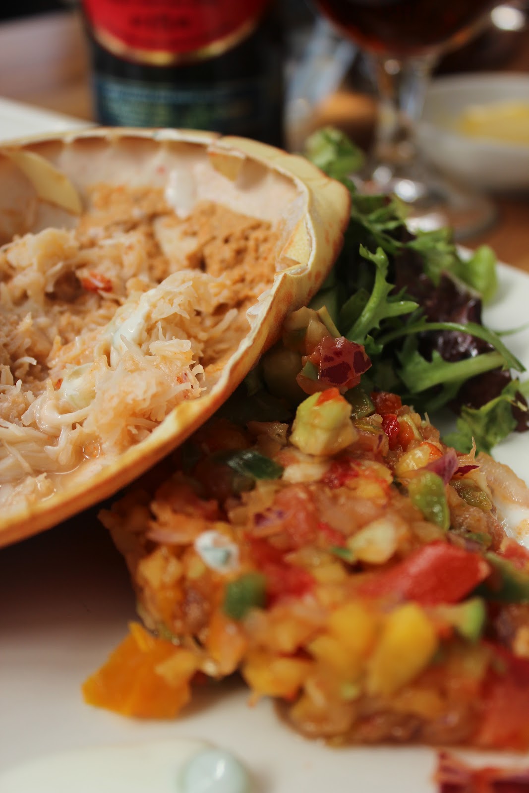 Kylmänä tarjoiltu taskurapuannos oli hyvä ja raikas, mutta myönnän, että tykkään enemmän valkoisesta (saksi?)lihasta, kuin keltaisesta massasta, jota ravun keskikuoressa oli. Kastikkeiden kanssa rapu kuitenkin toimi, enkä jäänyt nälkäiseksi. Isännän simpukat sen sijaan olivat täysosuma, liemi antoi muhevan savuisan maun hentoihin simpukoihin, ja pääraaka-aineen loputtua lusikoimme vielä liemet kulhon pohjalta parempiin suihin. Hintaa kahdelle annokselle, kahdelle oluelle ja leipäkorille tuli kolmisenkymmentä puntaa, mutta ravintolalla ei ollut erillistä lounaslistaa, vaan kaikki annokset olivat normaalilta ala carte -listalta.