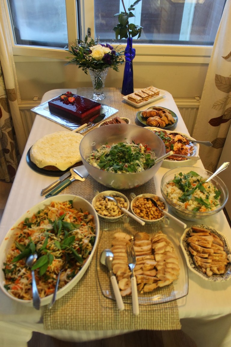 Tarjoiluja kuitenkin oli, totta kai. Osasta löytyy linkit aiempiin teksteihin, ja jotain linkitän vielä myöhemmin, kun saan ohjeet kirjoitettua ylös. Koska juhlat osuivat niin lähelle vuodenvaihteen juhlakautta, ajattelimme, että kaiken jouluruuan mässäämisen jälkeen ei kenties vieraidenkaan tee vielä mieli raskaita voileipäkakkuja tai suolaisia piirakoita, vaan voisimme tehdä jotain salaattipohjaista, kevyttä lounasta, vaikkapa aasialaishengessä. Suhtauduin tähän kyllä lievällä haikeudella, koska kuitenkin olen voileipäkakkujen ystävä. Tarjoiluajatus toimi kuitenkin hyvin; Aasiaan vivahtava ruoka ei aiheuttanut vierastusta juhlijoissa ja salaattien kanssa oli helppo huomioida erilaiset ruoka-ainerajoitukset, kun salaatit, pähkinät, lihat ja kalat tarjottiin erikseen, ja ruoka oli luonnostaan laktoositonta ja gluteenitonta.